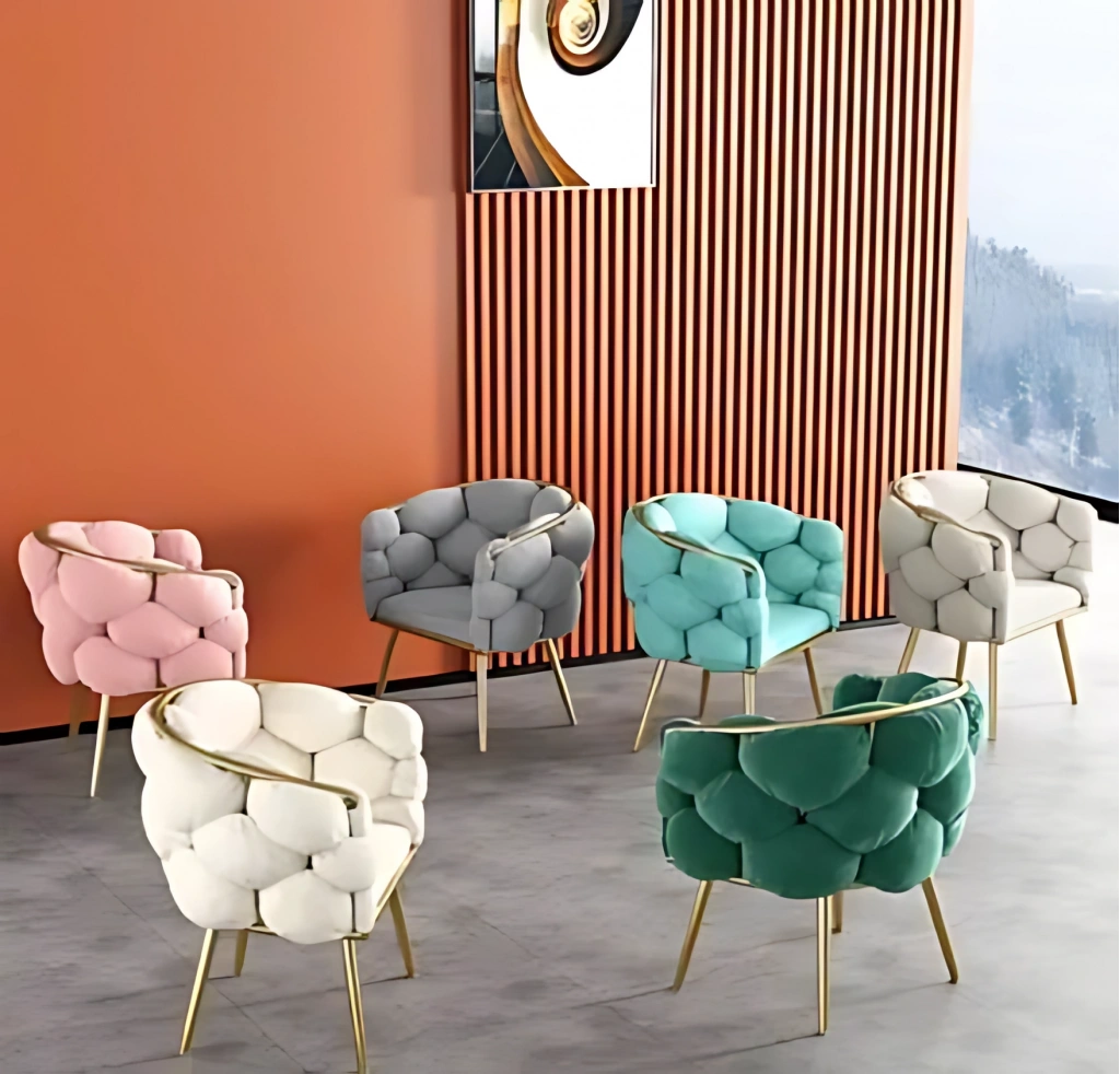 Küçük puflardan oluşan şık oturum ve sırt tasarımıyla öne çıkan bu sandalye, konfor ve estetiği bir araya getiriyor. Ahşap ayakları doğal bir görünüm sunarken, sağlam yapısı uzun süreli kullanım sağlar. Modern ve dekoratif tasarımıyla yemek odaları, salonlar veya ofis alanları için ideal bir seçimdir.