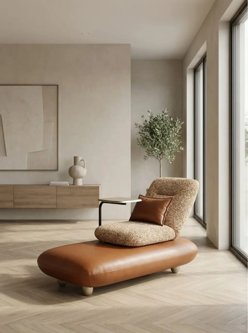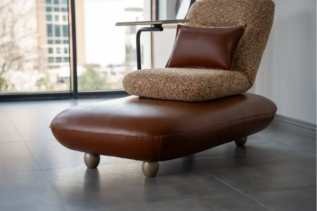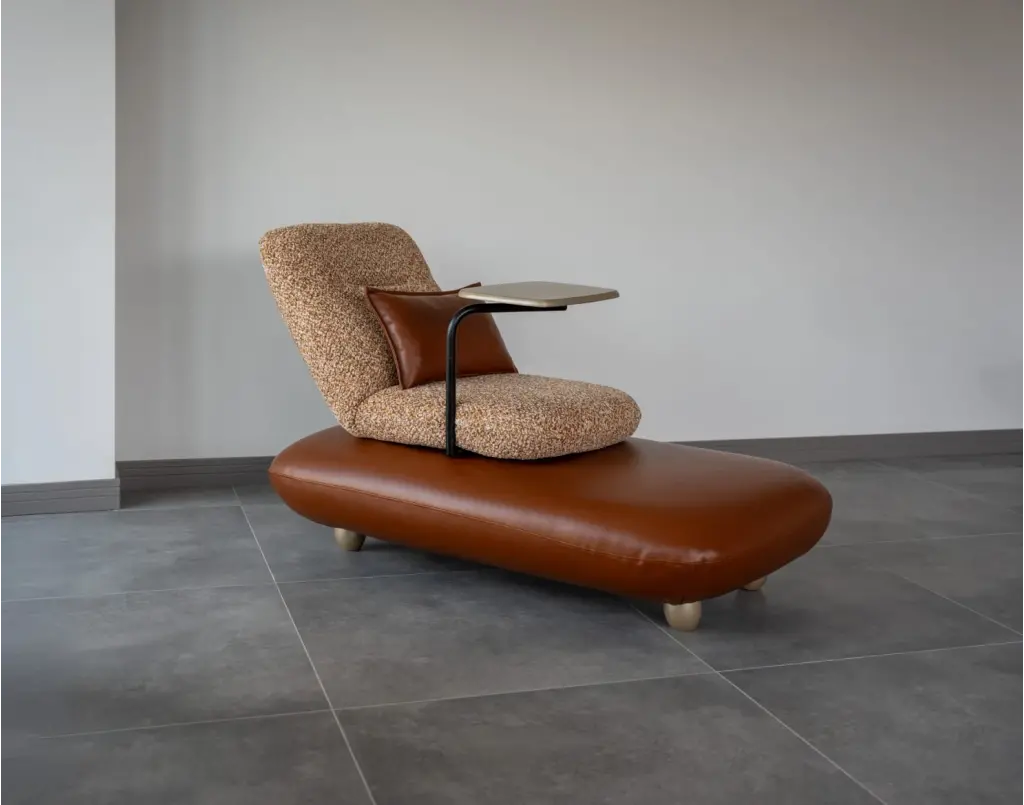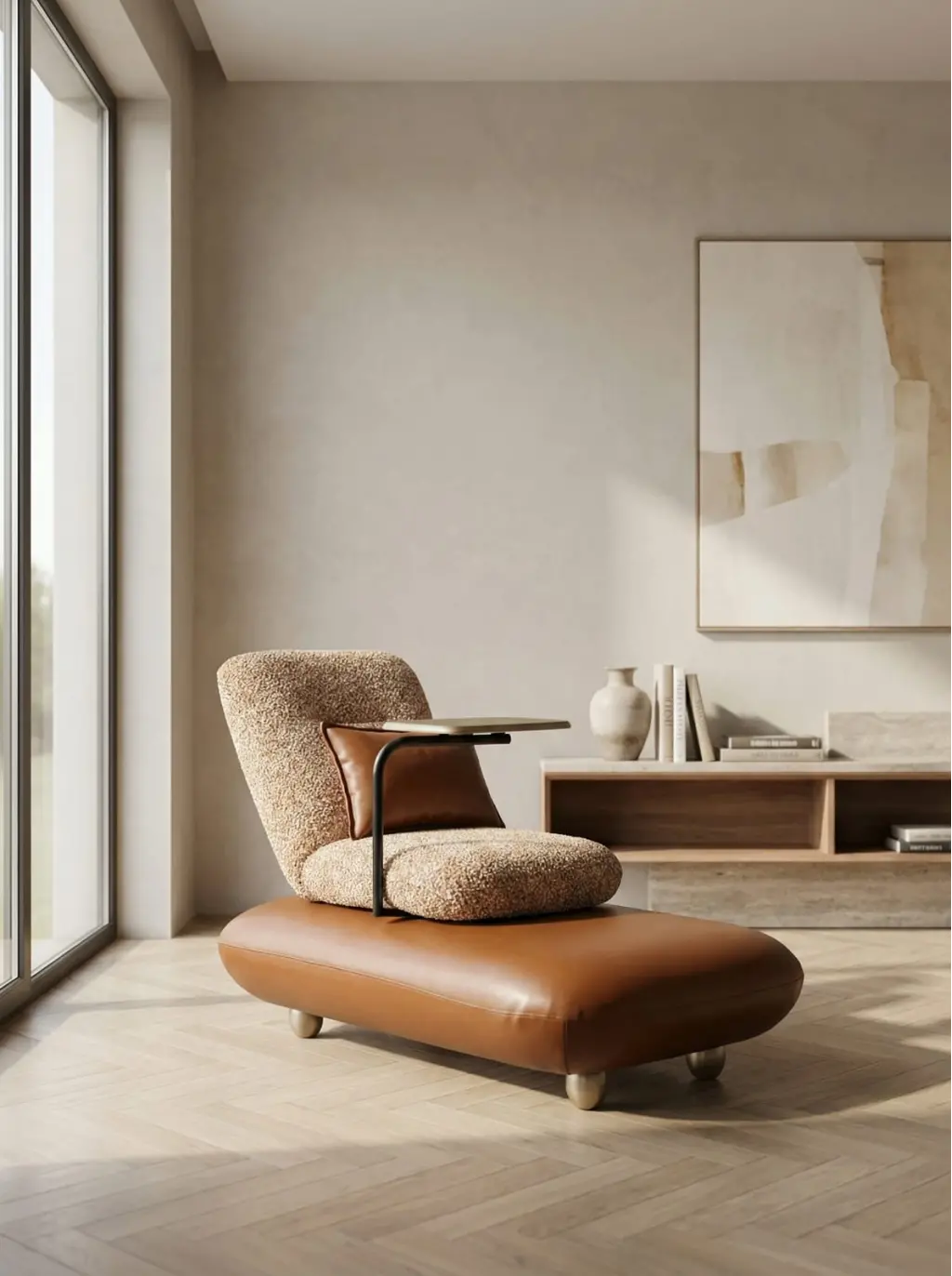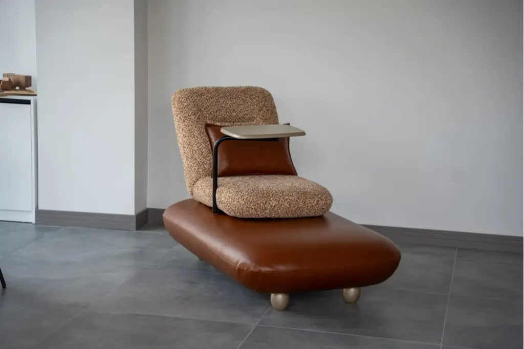 Bu tasarım, "Hybrid Solace" (Hibrit Teselli) felsefesiyle, dinlenme ve hafif çalışma rutinlerini birleştirmek amacıyla kurgulanmıştır. Alt gövdede kullanılan taba rengi deri (tan leather),tasarıma maskülen ve oturaklı bir temel sağlarken; oturum ve sırt kısmındaki "bouclé" (buklet) doku, kullanıcıyı sarmalayan bir yumuşaklık ve evsel bir sıcaklık sunar. Mobilyanın amorf ve yuvarlatılmış hatları, keskin köşelerden kaçınarak mekana akışkan bir enerji katar. Entegre edilen minimalist laptop sehpası, bu konfor odaklı parçayı bir "mini ofis" istasyonuna dönüştüren fonksiyonel bir müdahaledir.