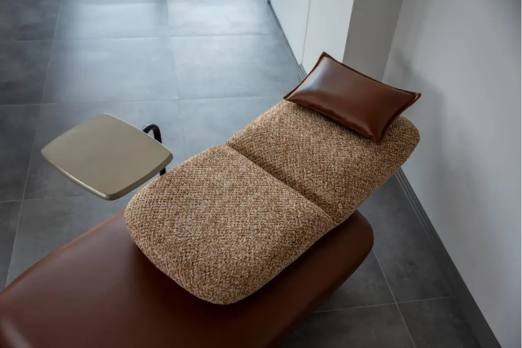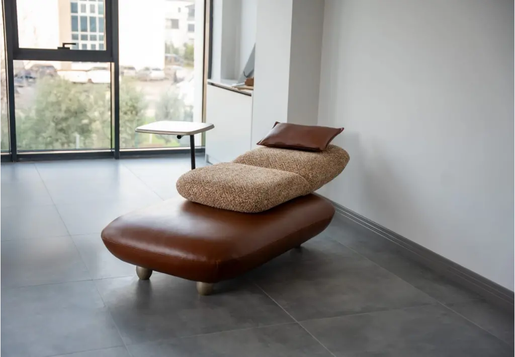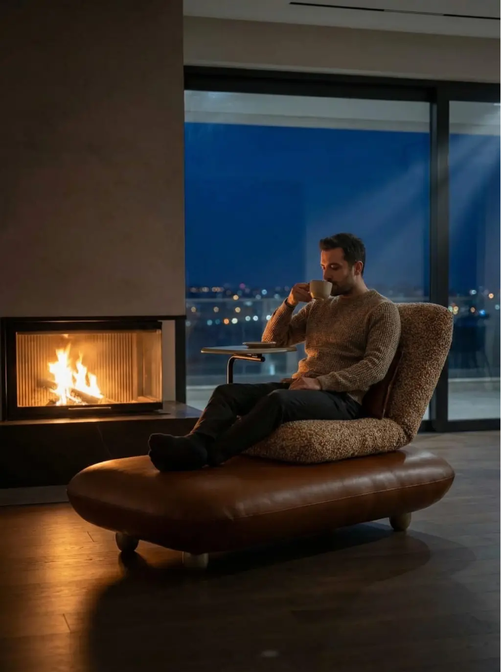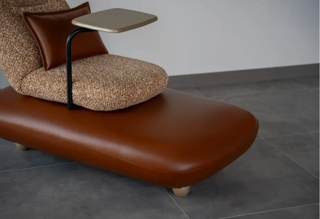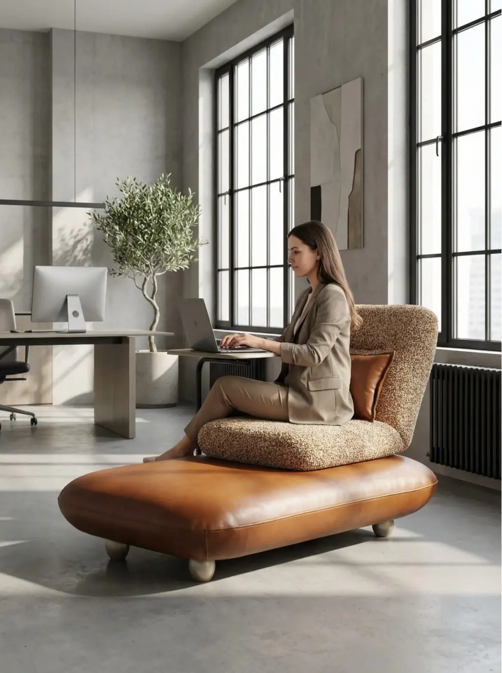 Bu tasarım, "Hybrid Solace" (Hibrit Teselli) felsefesiyle, dinlenme ve hafif çalışma rutinlerini birleştirmek amacıyla kurgulanmıştır. Alt gövdede kullanılan taba rengi deri (tan leather),tasarıma maskülen ve oturaklı bir temel sağlarken; oturum ve sırt kısmındaki "bouclé" (buklet) doku, kullanıcıyı sarmalayan bir yumuşaklık ve evsel bir sıcaklık sunar. Mobilyanın amorf ve yuvarlatılmış hatları, keskin köşelerden kaçınarak mekana akışkan bir enerji katar. Entegre edilen minimalist laptop sehpası, bu konfor odaklı parçayı bir "mini ofis" istasyonuna dönüştüren fonksiyonel bir müdahaledir.