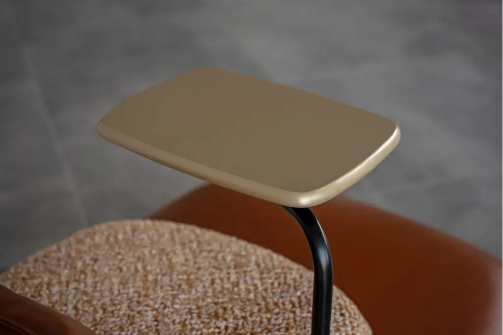 Integrated Utility: Siyah metal bir kol üzerinde yükselen lake tabla, estetiği bozmadan çalışma imkanı sunan akıllıca bir eklenti.