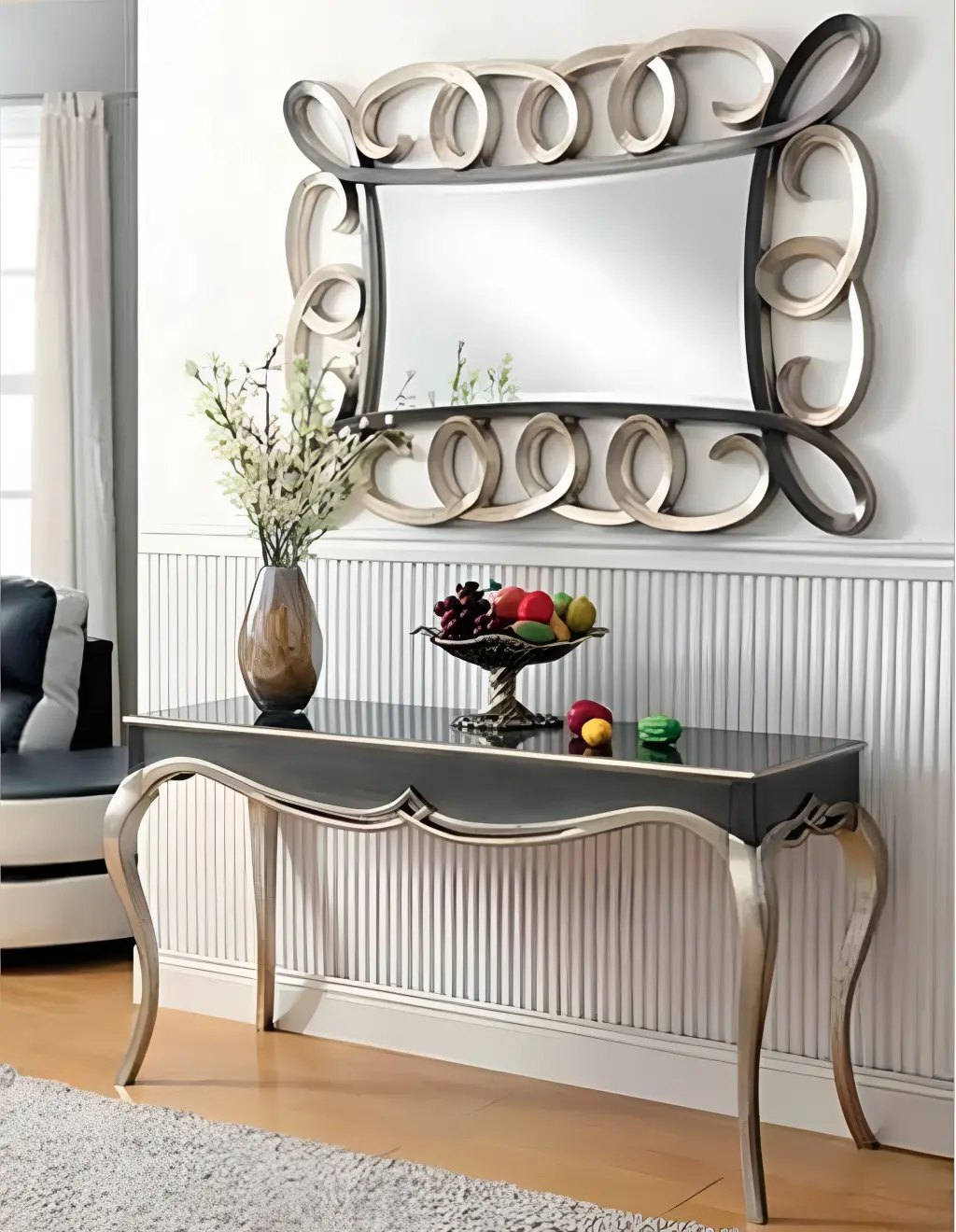Bu tasarım, "Contemporary Baroque" (Çağdaş Barok) felsefesiyle, geleneksel lüksün gösterişli kıvrımlarını modern bir sadelik ve grafiksel netlikle yeniden yorumlamak amacıyla kurgulanmıştır. Duvarda yer alan ayna ünitesinin siyah ve gümüş tonlarındaki çerçevesi, iç içe geçen Barok tarzı oyma motiflerini taklit eden dinamik ve simetrik bir döngü oluşturur. Bu form, mekandaki enerjiyi yansıtırken aynı zamanda gösterişli bir duvar sanatı gibi davranır. Altta yer alan konsolun parlak siyah üst tablası, malzemenin temiz ve yansıtıcı dokusunu koruyarak, kavisli gümüş metal ayaklar ve ayna çerçevesi ile sofistike bir tezatlık oluşturur. Konsol ayaklarının ve tablasının zarif Barok kavisleri, ayna çerçevesindeki dairesel motifler ile bütünleşerek tasarıma mimari bir denge kazandırır.
