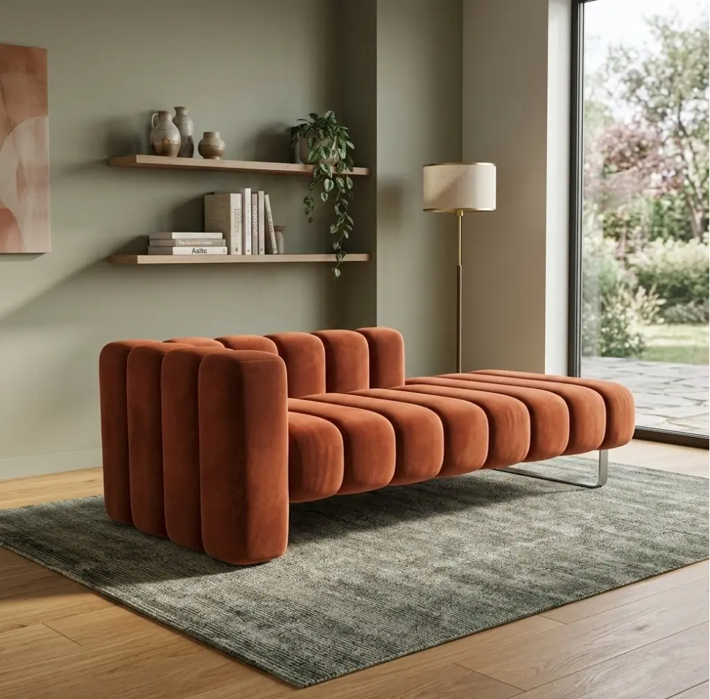 Bu uzanma koltuğu, "Segmented Continuity" (Parçalı Süreklilik) ilkesiyle tasarlanmıştır. Sırt dayama kısmından başlayıp ayak ucuna kadar kesintisiz akan geniş dikey dilimler (wide channel tufting),ürüne "somun ekmek" (loaf) benzeri pofuduk ve davetkar bir doku kazandırır. Seçilen kiremit/pas rengi (rust/terracotta) kadife kumaş, bu üç boyutlu yüzeyde ışık oyunları yaratarak 70'lerin "Groovy" ruhunu modern bir lüksle birleştirir. Altındaki incecik krom metal ayaklar, bu kütlesel ve dolgun gövdeyi zeminden nazikçe kopararak tasarıma "havada asılı" (floating) hafif bir silüet verir.? Ölçüler (Tahmini/Standart):