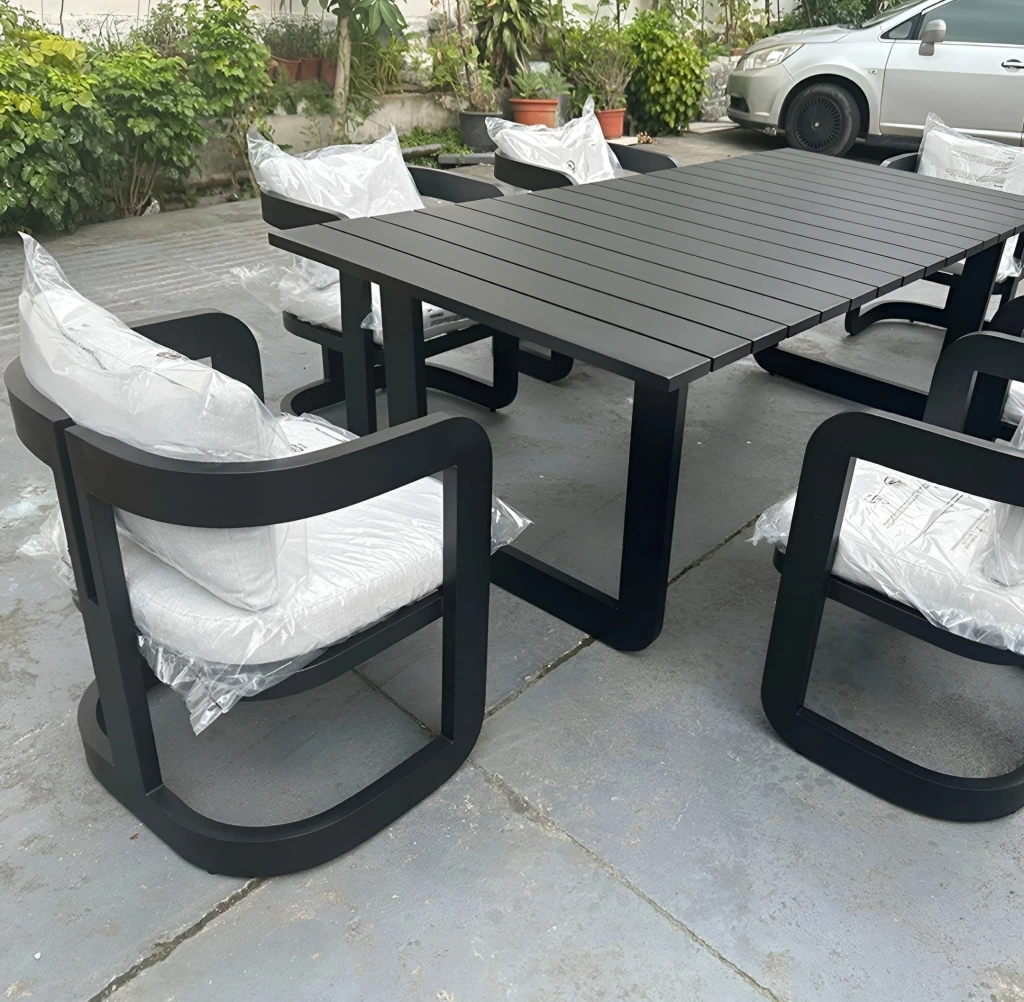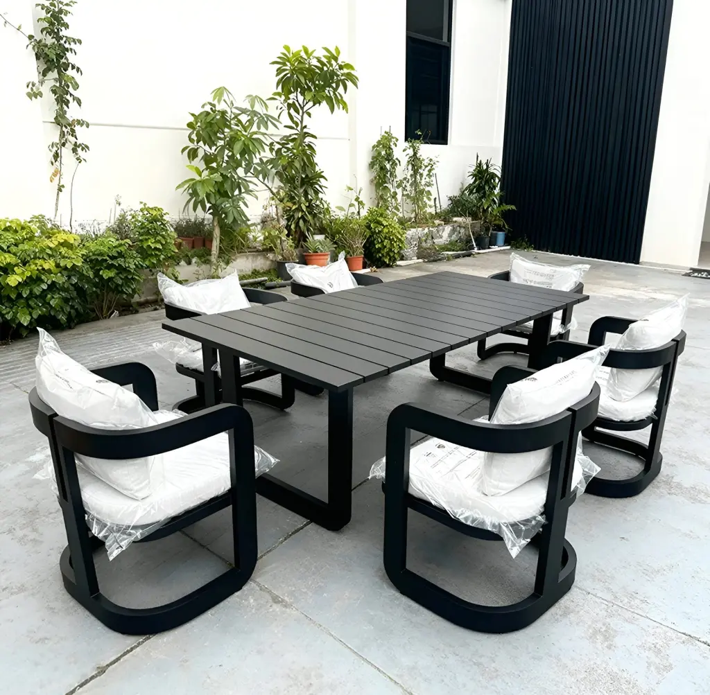 Bahçenize sade ve şık bir görünüm kazandıran bu takım; 1 adet masa ve 6 adet sandalyeden oluşur. Konforlu oturumu ve geniş masa yüzeyi sayesinde hem günlük kullanım hem de misafir ağırlama için uygundur. Modern hattıyla her dış mekâna uyum sağlayarak balkon, teras veya bahçenizde keyifli bir kullanım sunar.