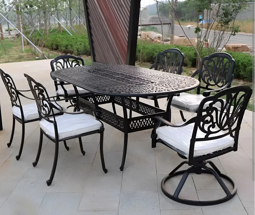 Bir adet oval masa ve 6 adet ergonomik sandalyeden oluşan bu takım, açık alanlarda hem fonksiyonel hem de dekoratif bir kullanım sağlar. Geniş masa yüzeyi, aile yemekleri ve misafir ağırlamak için ideal alan sunarken, ergonomik ve kalın minderli sandalyeler uzun süreli oturumlarda konfor sağlar.