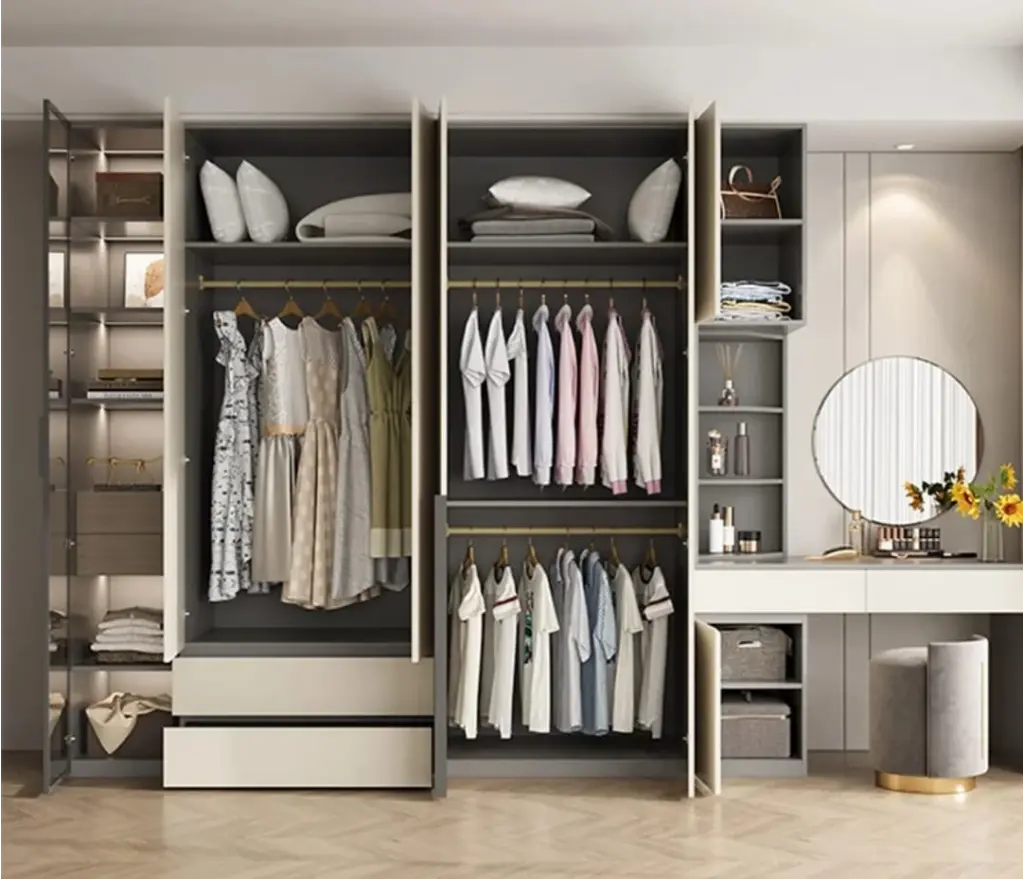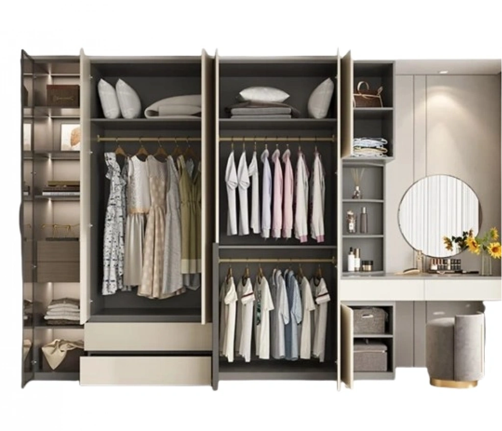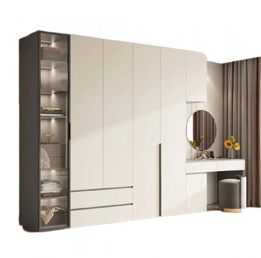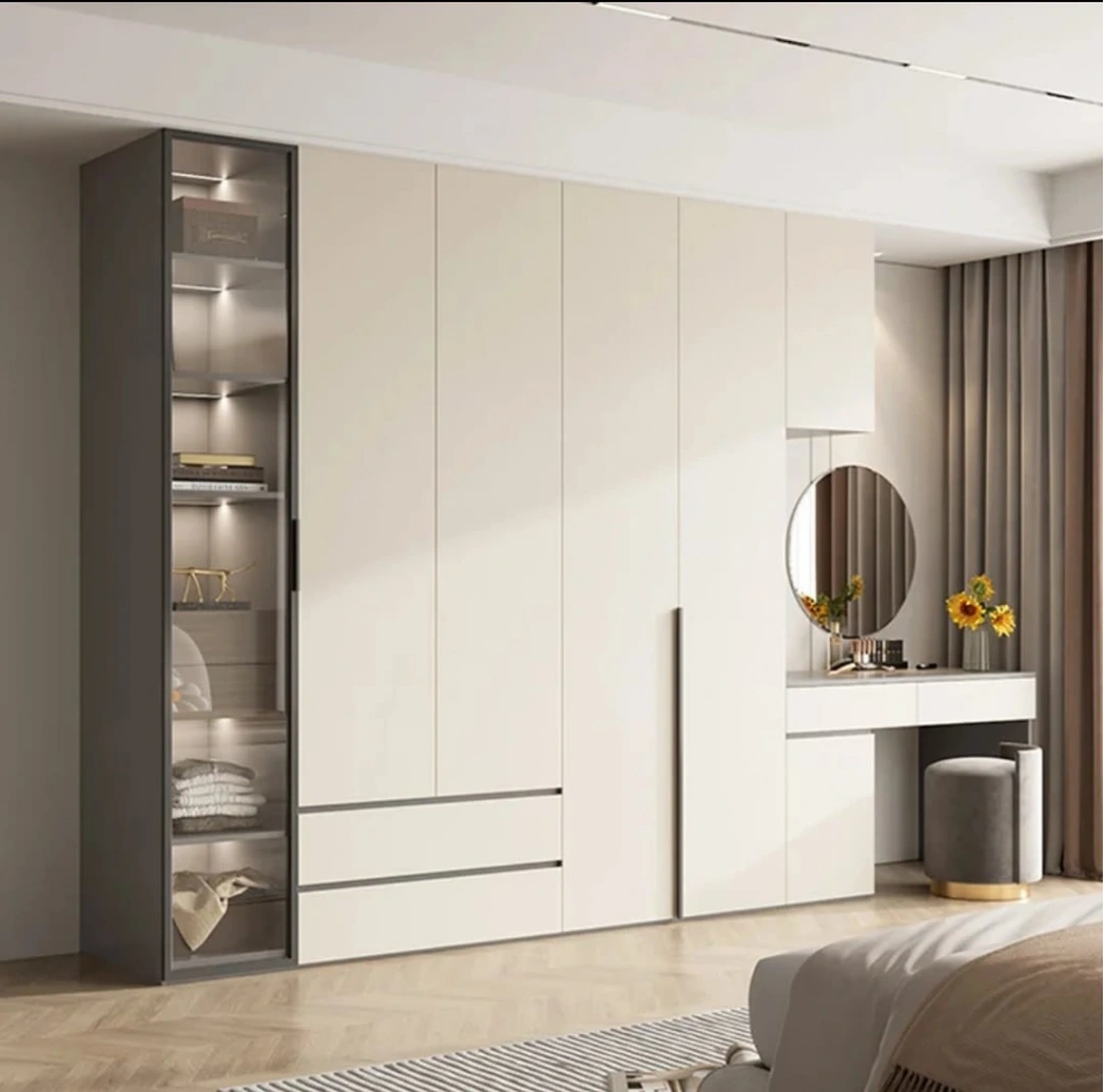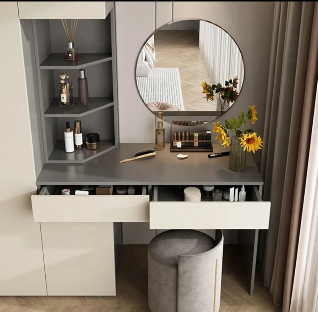 Fonksiyonelliği ve estetiği bir araya getiren bu özel tasarım, yatak odanıza hem şıklık hem de kullanım kolaylığı kazandırıyor. En soldaki camlı bölme ve çekmeceleri, kıyafetlerinizin ve aksesuarlarınızın düzenli bir şekilde saklanmasını sağlarken, birleşik makyaj masası ve aynası günlük hazırlıklarınızı konforlu hale getiriyor. Takıma dahil oturma pufu, hem rahat oturum sunar hem de dekoratif bir tamamlayıcıdır.