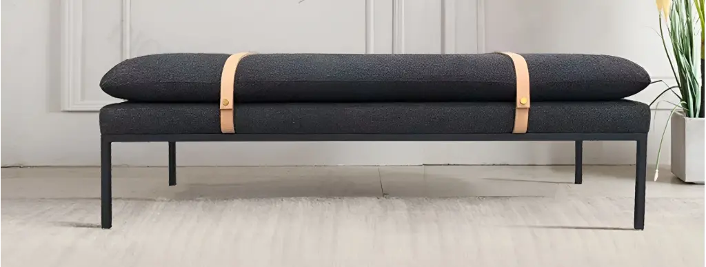Bu bank, "Structural Tension" (Yapısal Gerilim) prensibiyle kurgulanmıştır. Üst üste istiflenmiş gibi duran koyu antrasit minder blokları, iki yandan sarılan ham deri (taba) kemerlerle sıkıştırılarak forma sokulmuştur. Bu "bavul kayışı" estetiği, ürüne sanki her an alıp götürülebilirmiş gibi dinamik ve gezgin bir hava katar. Kumaşın yumuşaklığı ile gergin deri kayışların yarattığı fiziksel zıtlık, tasarımı teknik bir objeye dönüştürür. Altındaki ince siyah metal ayaklar, bu yüklü minder bloğunu zeminden kopararak tasarıma havadar bir silüet kazandırır.