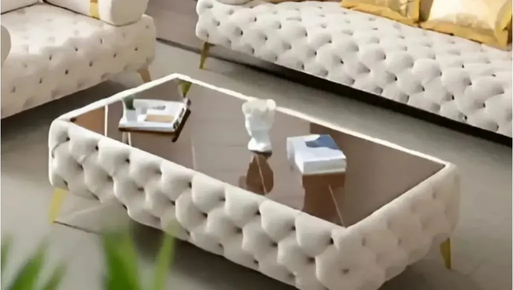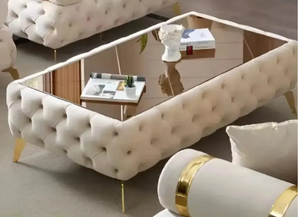 Bu orta sehpa, "Soft-Glamour" (Yumuşak İhtişam) estetiğiyle tasarlanmıştır. Gövdenin yan yüzeyleri, klasik Chesterfield kanepelerde görmeye alışkın olduğumuz derin düğme kapitone (deep button tufting) işçiliğiyle bezenmiştir. Bu yumuşak kumaş dokusu, sert mobilya algısını kırar. Üst tabla ise sıradan cam yerine, mekana derinlik katan ve üzerindeki objeleri (büst, kitap vb.) sanatsal bir şekilde yansıtan bronz/gold aynalı yüzeyden oluşur. Sehpayı yerden yükselten zarif altın rengi metal ayaklar, tasarımdaki lüks algısını tamamlar.