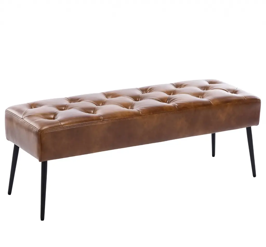 Bu bank, "Visual Weight Contrast" (Görsel Ağırlık Zıtlığı) prensibiyle tasarlanmıştır. Üst kısımdaki eskitme konyak (cognac) deri görünümlü döşeme, klasik derin düğmeli kapitone (deep button tufting) işçiliğiyle hacimli ve "ağır" bir duruş sergiler. Bu güçlü gövde, altındaki ince siyah kalem ayaklar (pencil/tapered legs) ile tam bir tezat oluşturur. Metal ayakların zemine incecik dokunuşu, üstteki kütlesel ağırlığı görsel olarak hafifletir ve ürüne modern bir silüet kazandırır. Bu parça, "New York Loft" dairelerinin o ham ama lüks havasını (Raw Luxury) yatak ucunuza veya salonunuza taşır.