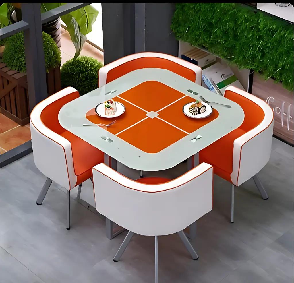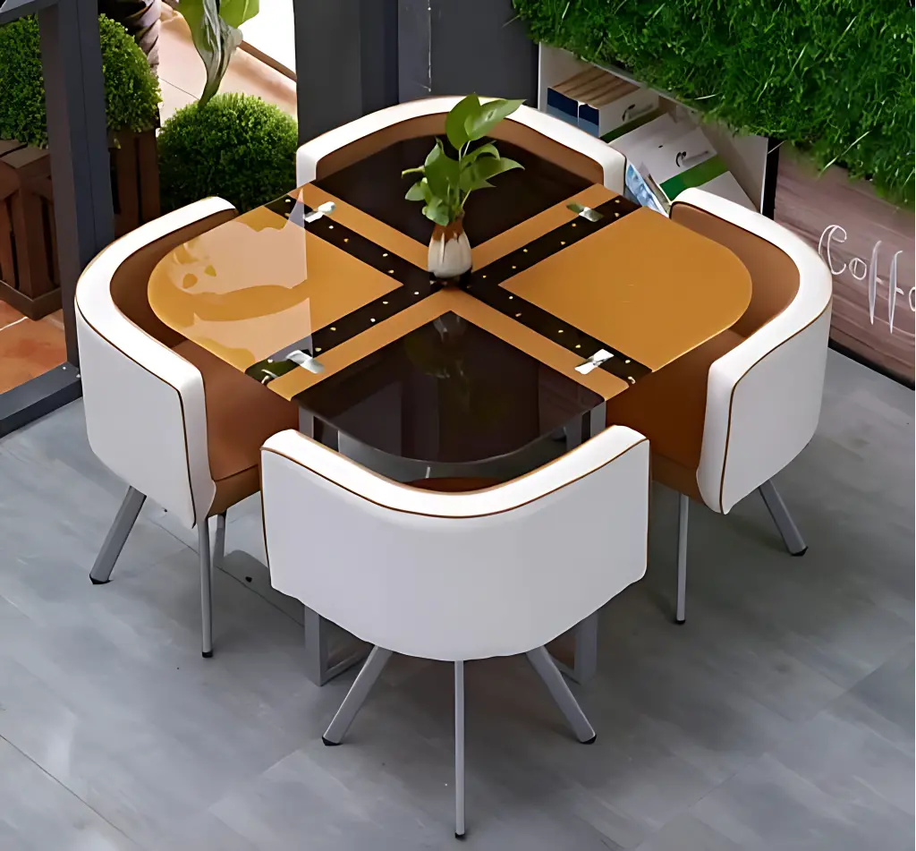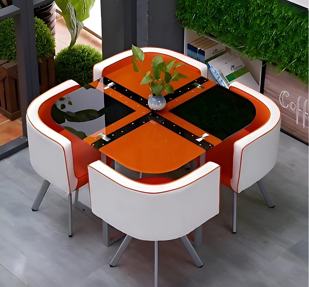 Yuvarlatılmış kenar detayları sayesinde sandalyelerin köşelere tam oturduğu bu kare masa takımı, hem estetik hem de işlevsellik sunuyor. Dört adet ergonomik sandalyesiyle birlikte tasarlanan takım, kompakt yapısıyla küçük alanlarda dahi şık bir kullanım sağlar. Modern çizgileri ve pratik formu ile yaşam alanlarınıza uyumlu bir seçimdir.