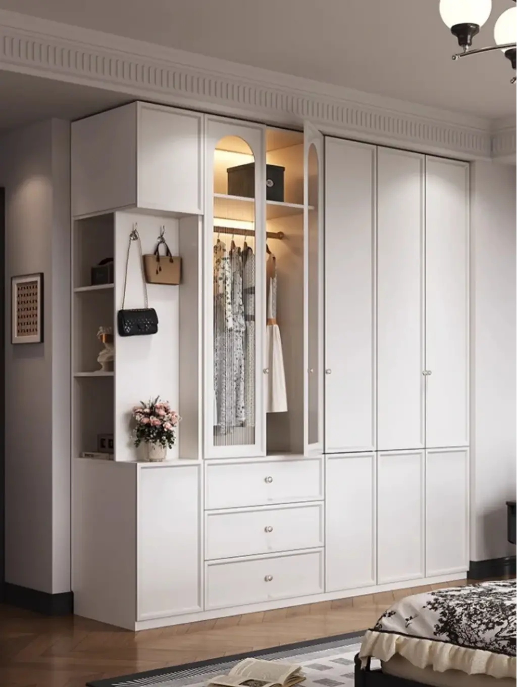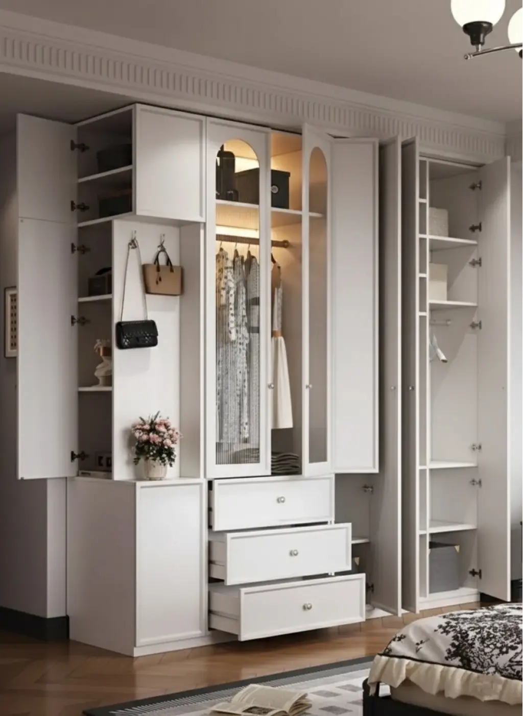 Bu ünite, klasik gardırop anlayışını yıkarak yerine kişisel bir butik deneyimi koyar. Tasarımın odak noktası, merkezdeki "Kemerli Cam Vitrin"dir. Bu oval hatlı mimari detay, beyazın steril duruşuna romantik bir yumuşaklık katarken; içindeki sıcak aydınlatma en sevdiğiniz kıyafetleri bir sanat eseri gibi sergiler. Sol taraftaki "Açık Hazırlık Nişi", gündelik çantalarınız ve aksesuarlarınız için hızlı bir erişim alanı (grab-and-go zone) sunarak yaşam akışınızı hızlandırır. Üst kısımdaki detaylı taç (kartonpiyer) işçiliği, bu modern kurguyu tavana bağlayan neoklasik bir imza niteliğindedir.