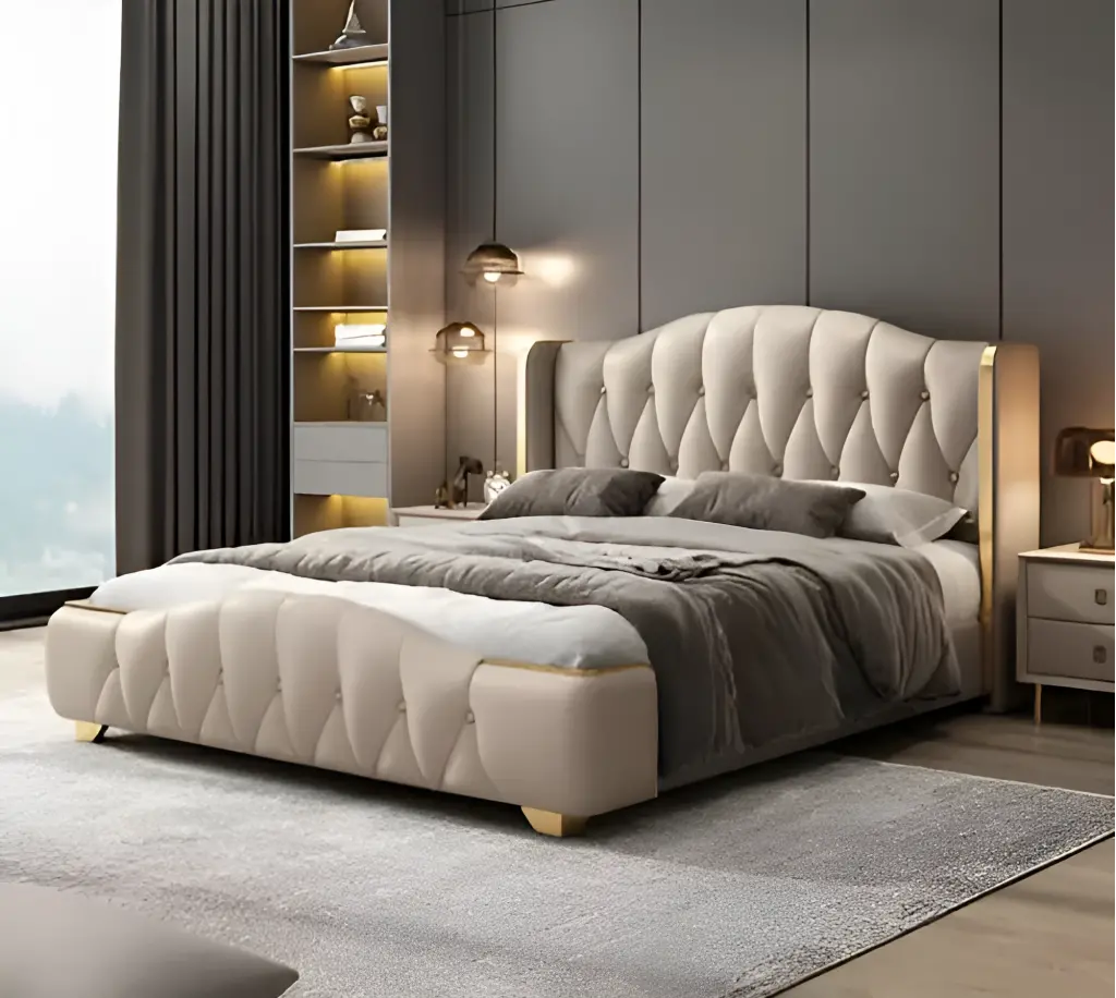 Göz alıcı detayları ve işlevsel yapısıyla öne çıkan bu çift kişilik baza ve başlık takımı, yatak odanıza hem zarif bir görünüm kazandırır hem de düzenli bir kullanım alanı sunar. Başlık bölümü, klasik kapitone dikişlerle zenginleştirilmiş olup yumuşak dokulu kumaşıyla hem estetik hem de konforlu bir dokunuş sağlar. Düğmeli tasarımıyla dikkat çeken başlık, baza kenarlarıyla aynı kumaştan üretilerek bütüncül bir görünüm oluşturur.