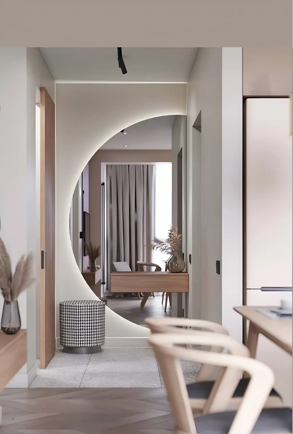 Sculptural Frame Design: Ayna çerçevesinin bir imza niteliği taşıyan, duvarda süzülen heykelsi ve kesintisiz form yapısı.