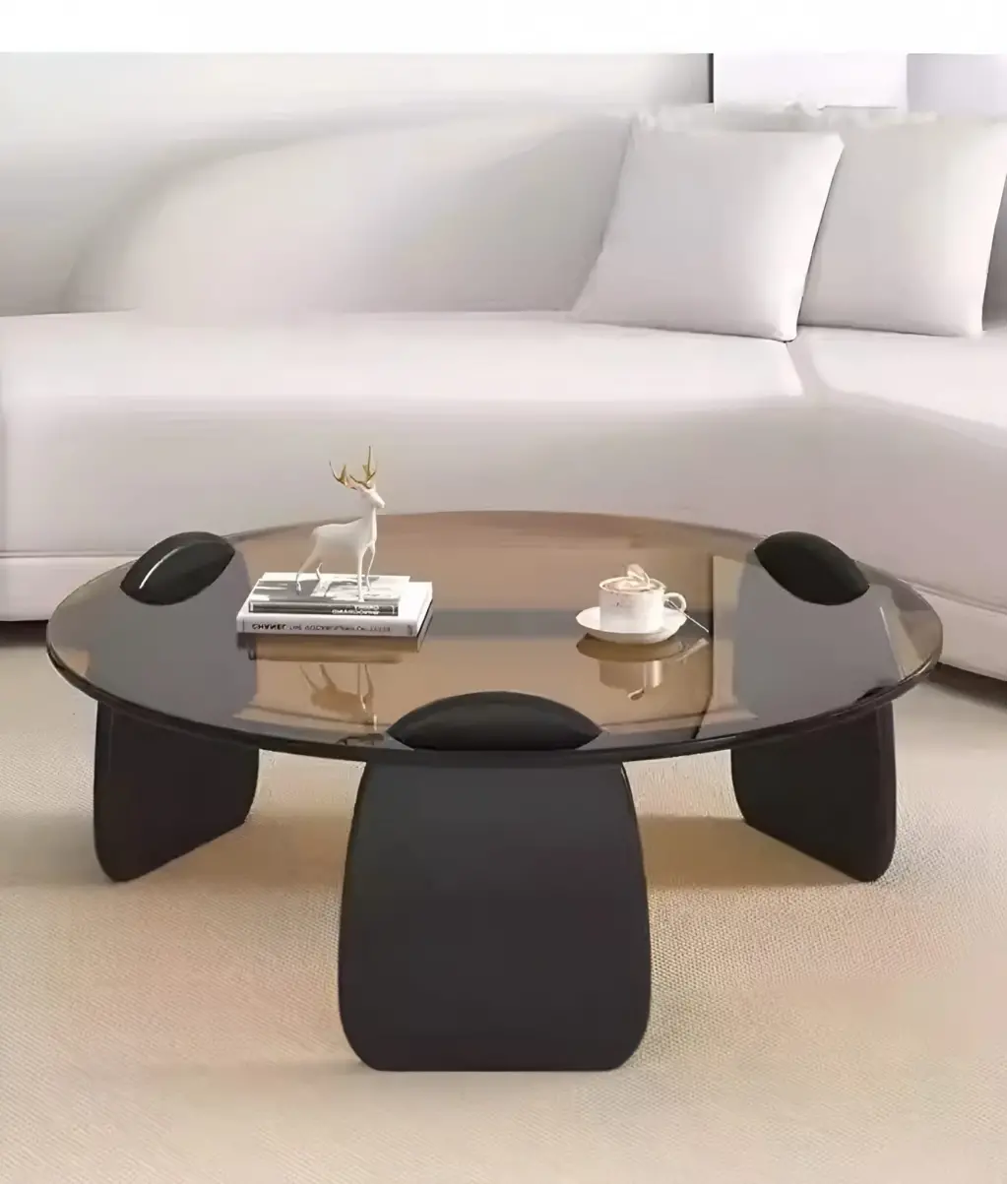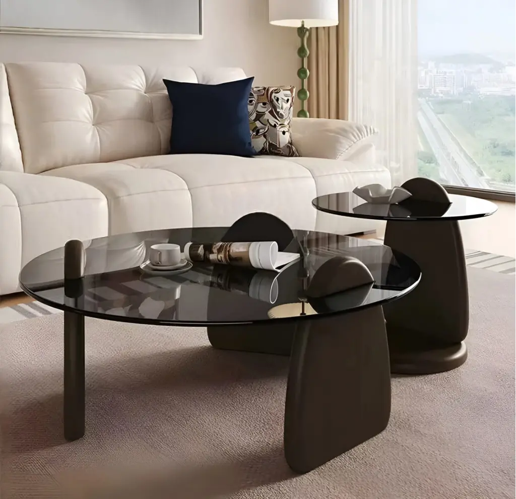 Bu tasarım, "Intersecting Shadows" (Kesişen Gölgeler) felsefesiyle, şeffaf yüzeyler ve ağır kütleler arasındaki dengeyi keşfetmek amacıyla kurgulanmıştır. Üst tablada kullanılan füme cam, mekana derinlik ve modern bir gizem katarken; alt kaidedeki koyu antrasit/kahve tonlu amorf ayaklar, tasarıma yere sağlam basan heykelsi bir temel sağlar. Cam tablanın içinden yükselen dairesel başlık detayları, malzemenin iç içe geçtiği illüzyonunu yaratarak tasarıma mimari bir ritim kazandırır. Farklı boyutlardaki ikili set yapısı, mekanda dinamik bir hiyerarşi ve kullanım esnekliği oluşturur.