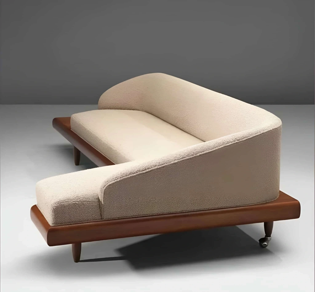 Mid-Century modern stilini günümüz trendleriyle harmanlayan bu özel tasarım kanepe, yaşam alanlarında odak noktası olmaya adaydır. Koyu tonlu masif ahşap bazası ve konik ayakları, zeminden yükselerek ferah ve yüzer bir görünüm sağlar. Üzerindeki krem rengi yumuşak dokulu (bukle/kıvırcık) döşemesi, asimetrik olarak alçalan kavisli sırt yapısıyla birleşerek hem oturma hem de şık bir uzanma (daybed) alanı sunar. Tasarımındaki tekerlekli arka ayak detayı, ürüne hem özgün bir karakter hem de konumlandırma kolaylığı katar.