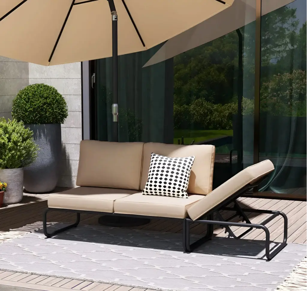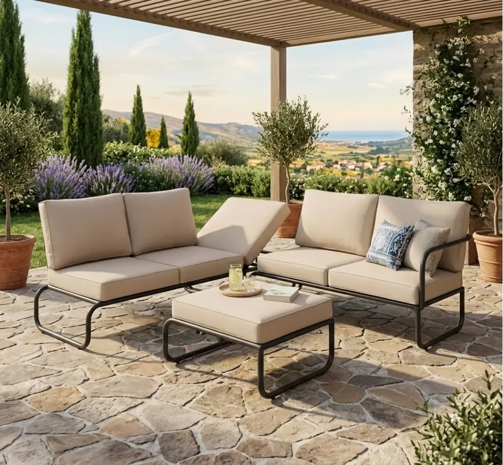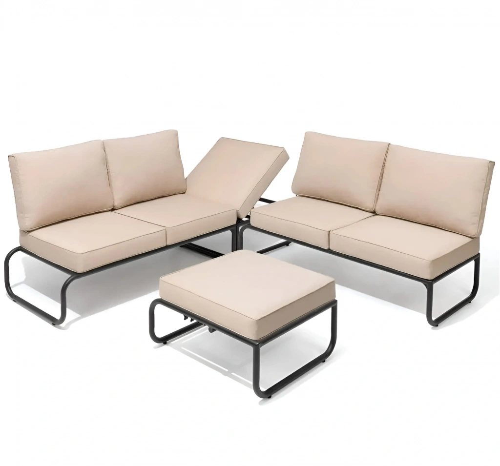Konforu ve modern görünümü bir arada sunan bu bahçe takımı; 2 adet ikili oturum, 1 adet puf ve esnek kullanım sağlayan modüllerden oluşur. İkili oturumlardan biri şezlong tarzı yapısıyla daha geniş bir uzanma alanı sunarken, diğer bölüm klasik oturum konforu sağlar. Dengeli çizgileri, yumuşak minderleri ve uyumlu tasarımıyla balkon, teras ve bahçelerde keyifli bir ortam oluşturur.