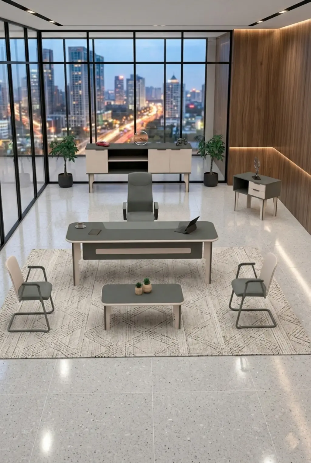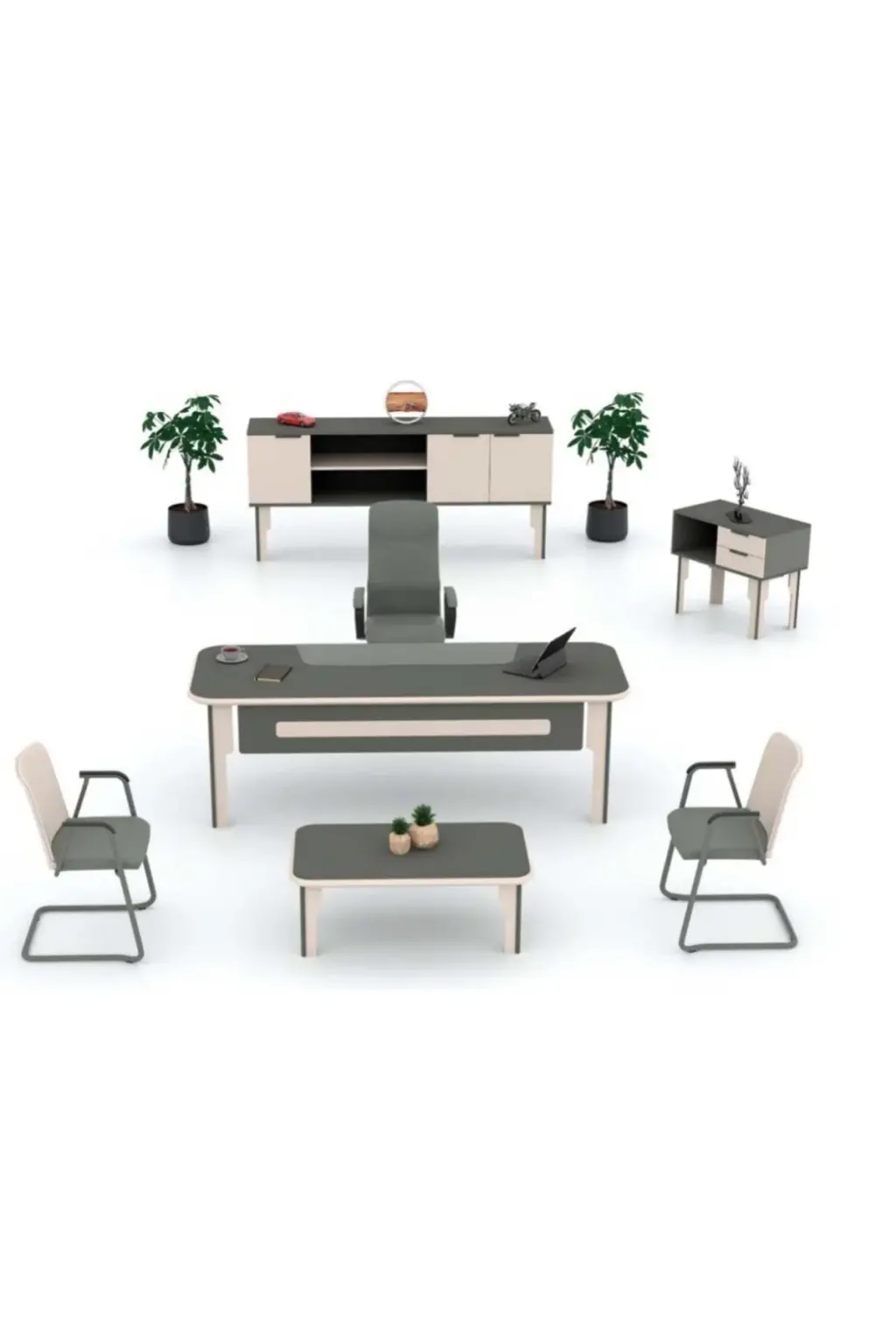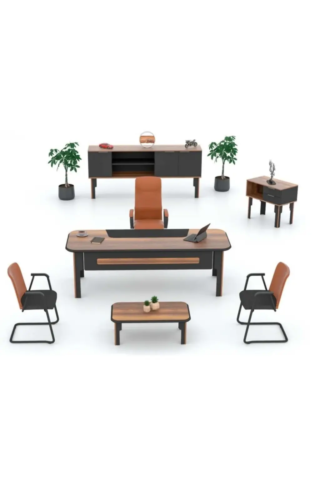 Modern çizgileri, işlevsel tasarımı ve prestijli görünümüyle bu ofis takımı, çalışma alanınıza hem şıklık hem de düzen kazandırır. Set içerisinde yer alan geniş masa, rahat çalışma imkânı sunarken, yan tarafında bulunan uzun çekmeceli dolap dosya ve evraklar için ideal saklama alanı sağlar. Ergonomik ofis sandalyesi, uzun süreli oturumlarda konfor sunarken, ön kısımda konumlanan iki adet misafir sandalyesi ve aralarındaki sehpa, ziyaretçileriniz için şık ve rahat bir alan oluşturur. Sağ tarafta yer alan ek masa ise fazladan çalışma veya ekipman yerleşimi için işlevsellik katar.