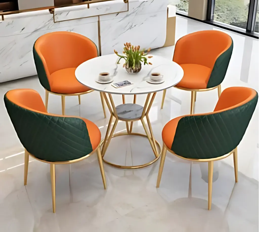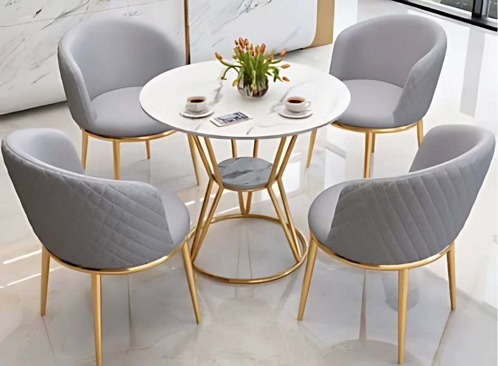 Şık ve modern tasarımıyla öne çıkan bu yuvarlak masa ve 4 sandalye takımı, yemek alanlarınıza hem estetik hem de fonksiyonel bir dokunuş katıyor. Sandalyelerin hafif yuvarlak hatları rahat oturum sağlarken, masanın küçük yuvarlak formu alanı ferah gösterir. Masanın sağlam ve estetik ayak yapısı, demir konstrüksiyon üstünde dengeli durarak uzun ömürlü kullanım sunar.