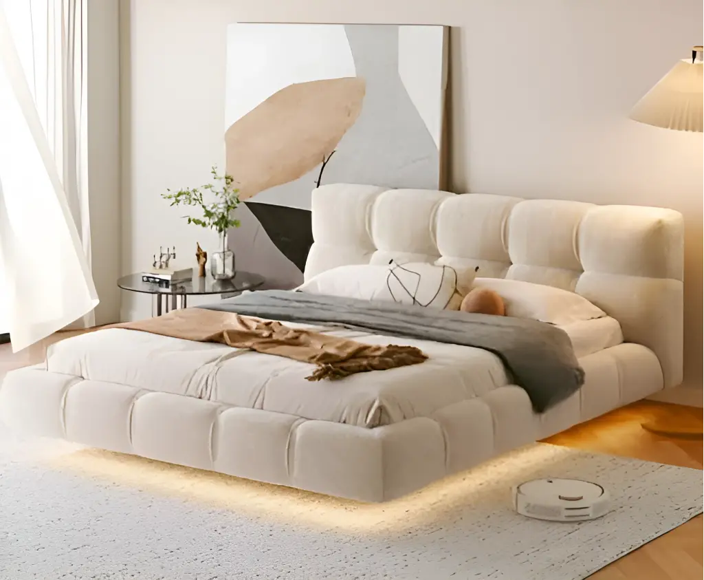 Beyaz renkte bombeli ayaklar, zeminden yüksek yapısıyla temizlik kolaylığı sağlarken baza yapısına zarif bir detay katar. Açık krem rengi döşemesi, pek çok farklı dekorasyon stiline uyum sağlayarak yatak odanıza ferah ve dengeli bir görünüm kazandırır.