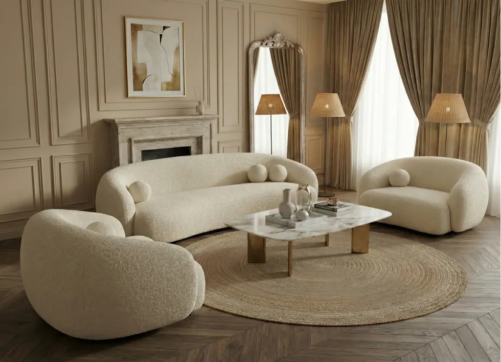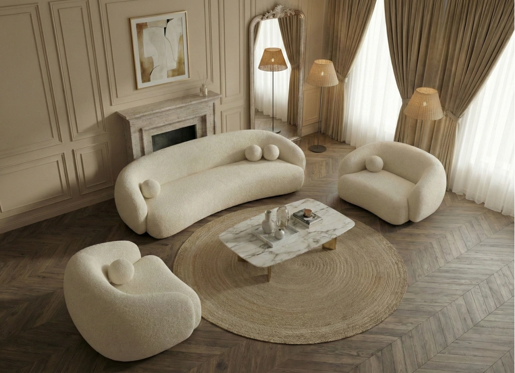Sıradan ve köşeli koltuk takımlarının aksine bu set, salonunuza akışkanlık ve dinginlik katar. Gövdeyi tamamen saran yumuşak bukle (teddy) doku; tasarıma sadece görsel bir sıcaklık değil, aynı zamanda dokunsal bir lüks hissiyatı yükler. Keskin hatlardan arındırılmış kavisli (böbrek) formu, mekana modern bir galeri havası verirken, seti tamamlayan küresel yastıklar tasarıma sanatsal bir dokunuş ekler. Kremin ferahlığı ile formun yumuşaklığını buluşturan bu parça, modern "Parisian" ve "Soft Minimalist" evlerin vazgeçilmezi olacak.