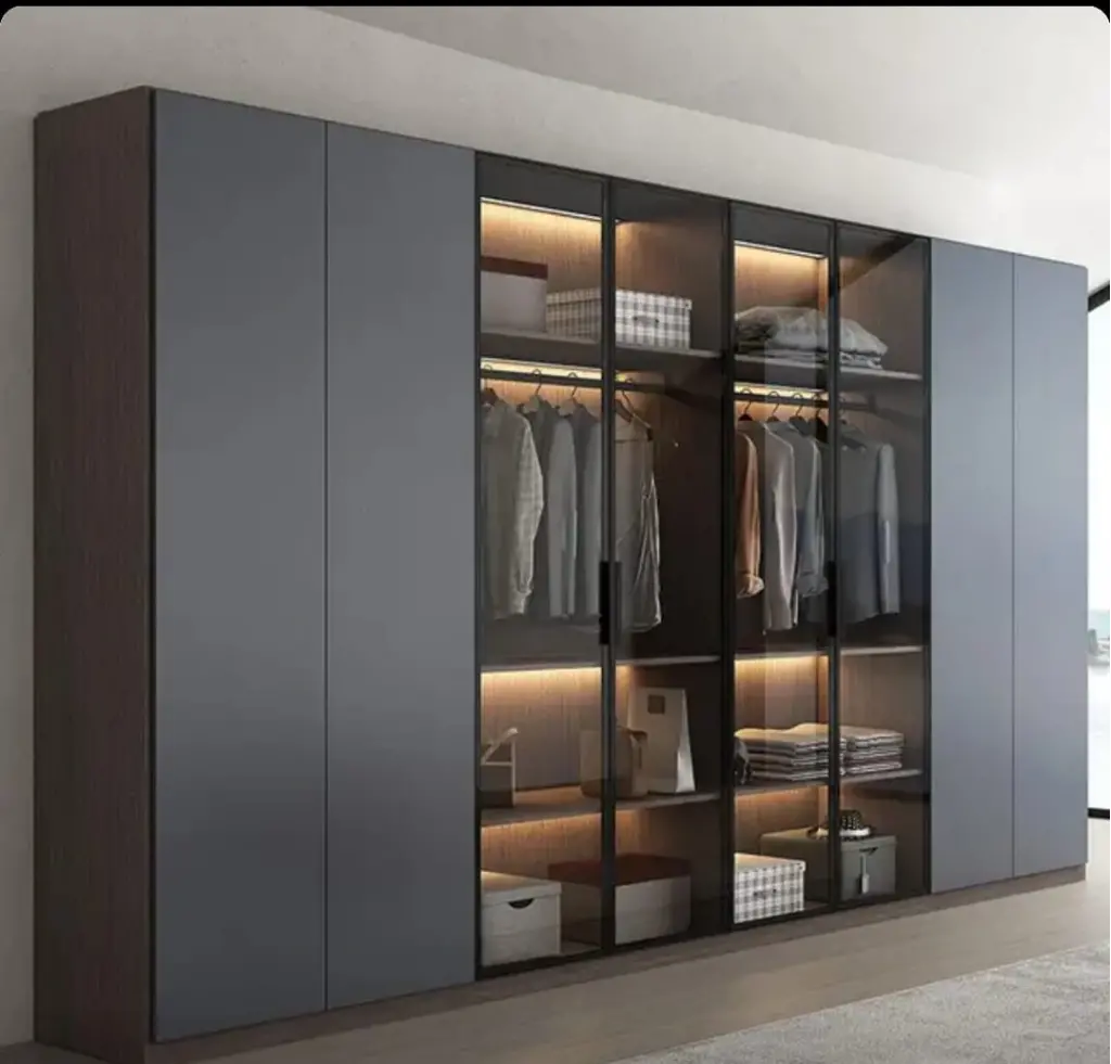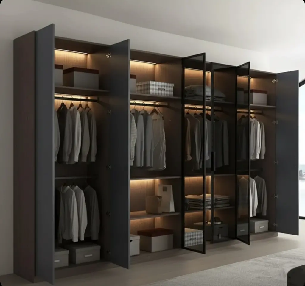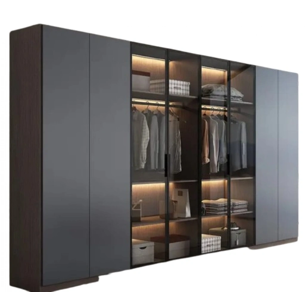 Fonksiyonellik ve şıklığı bir araya getiren bu geniş gardırop, modern tasarımıyla yatak odanıza zarif bir dokunuş katıyor. Orta bölümde yer alan camlı kapak, iç kısmın dekoratif olarak sergilenmesini sağlarken, yanlardaki kapaklar ve raflar ile kıyafetleriniz ve aksesuarlarınız düzenli bir şekilde saklanabilir.
