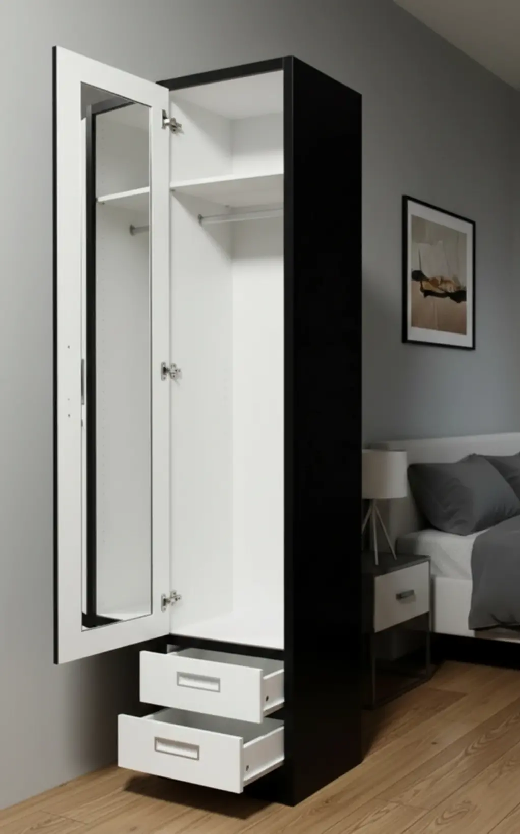 Bu ünite, siyahın çerçeveleyen gücü ile beyazın aydınlık yüzeyini tek bir "sütun" formunda birleştirir. Siyah dış karkas, ürüne net ve maskülen bir sınır çizerken; beyaz ön yüzey ve entegre ayna, bulunduğu dar alanı görsel olarak genişletir. Tasarımın üzerindeki metal kilit detayları ve keskin hatlı kulplar, ona sadece bir ev eşyası değil, "kişisel bir kasa" veya "özel bir kabin" havası katar. Alt kısımdaki çift çekmece bloğu, bu ince yapının ağırlık merkezini görsel olarak dengelerken, gündelik karmaşayı zemin seviyesinde hapseder.