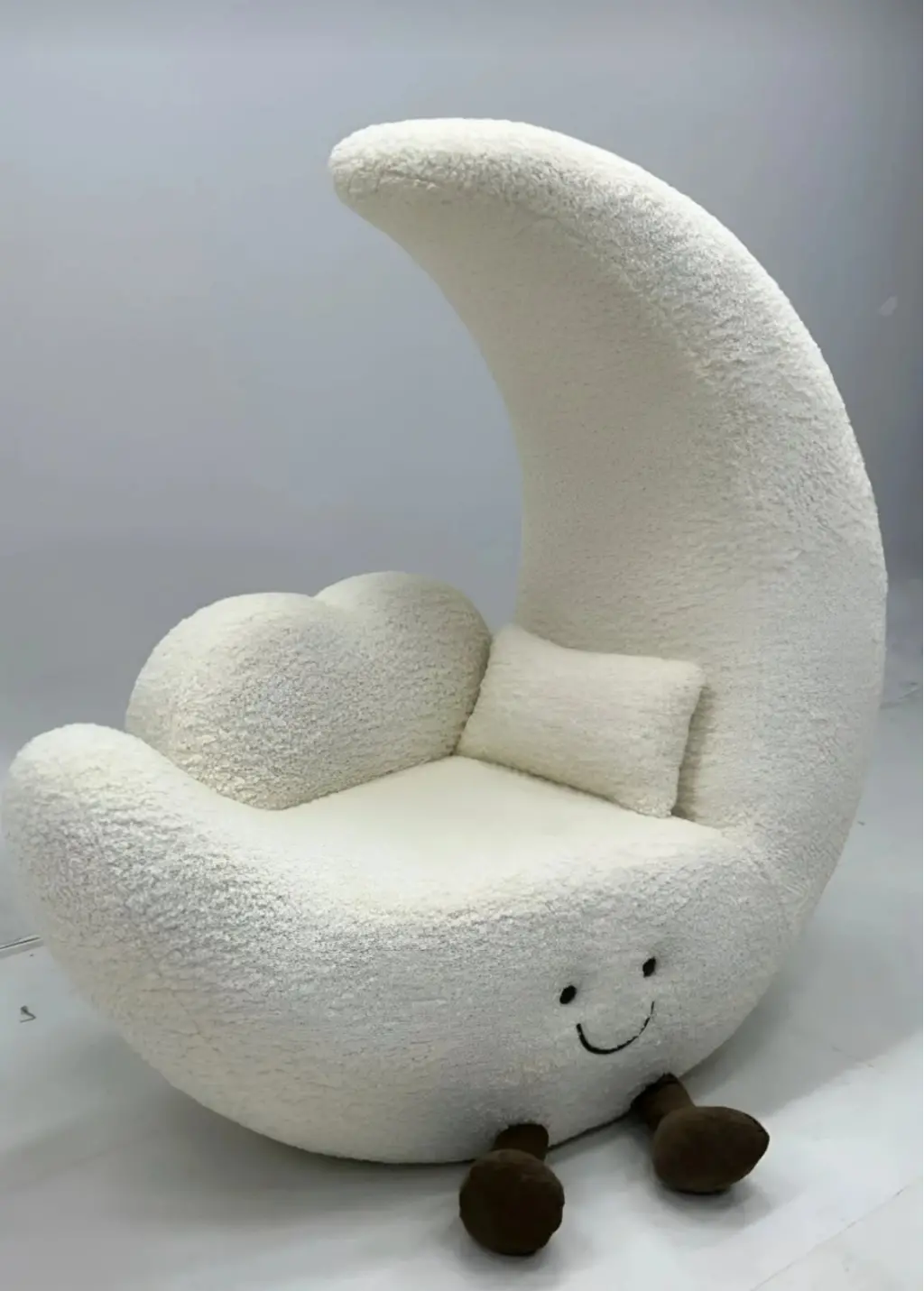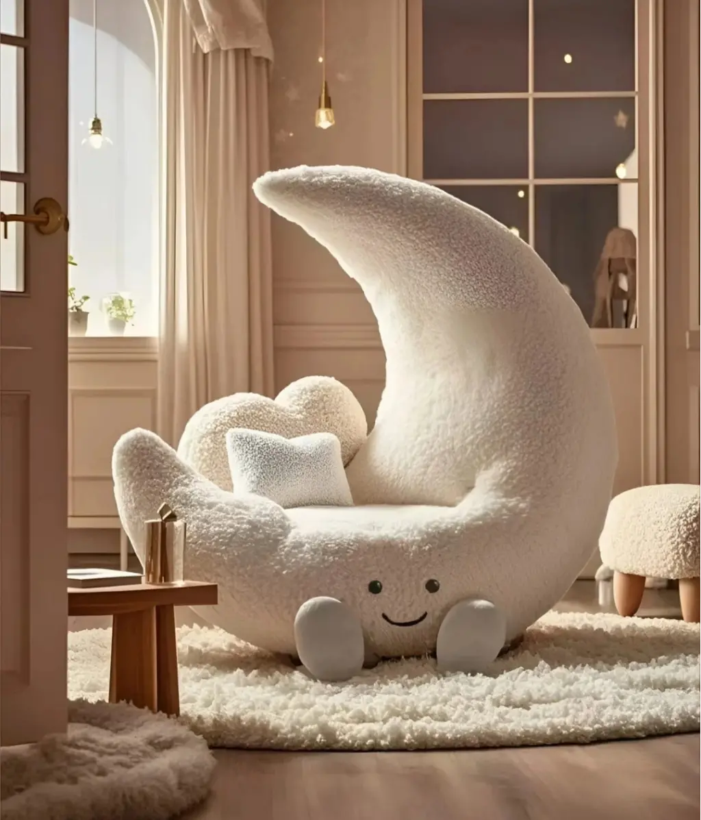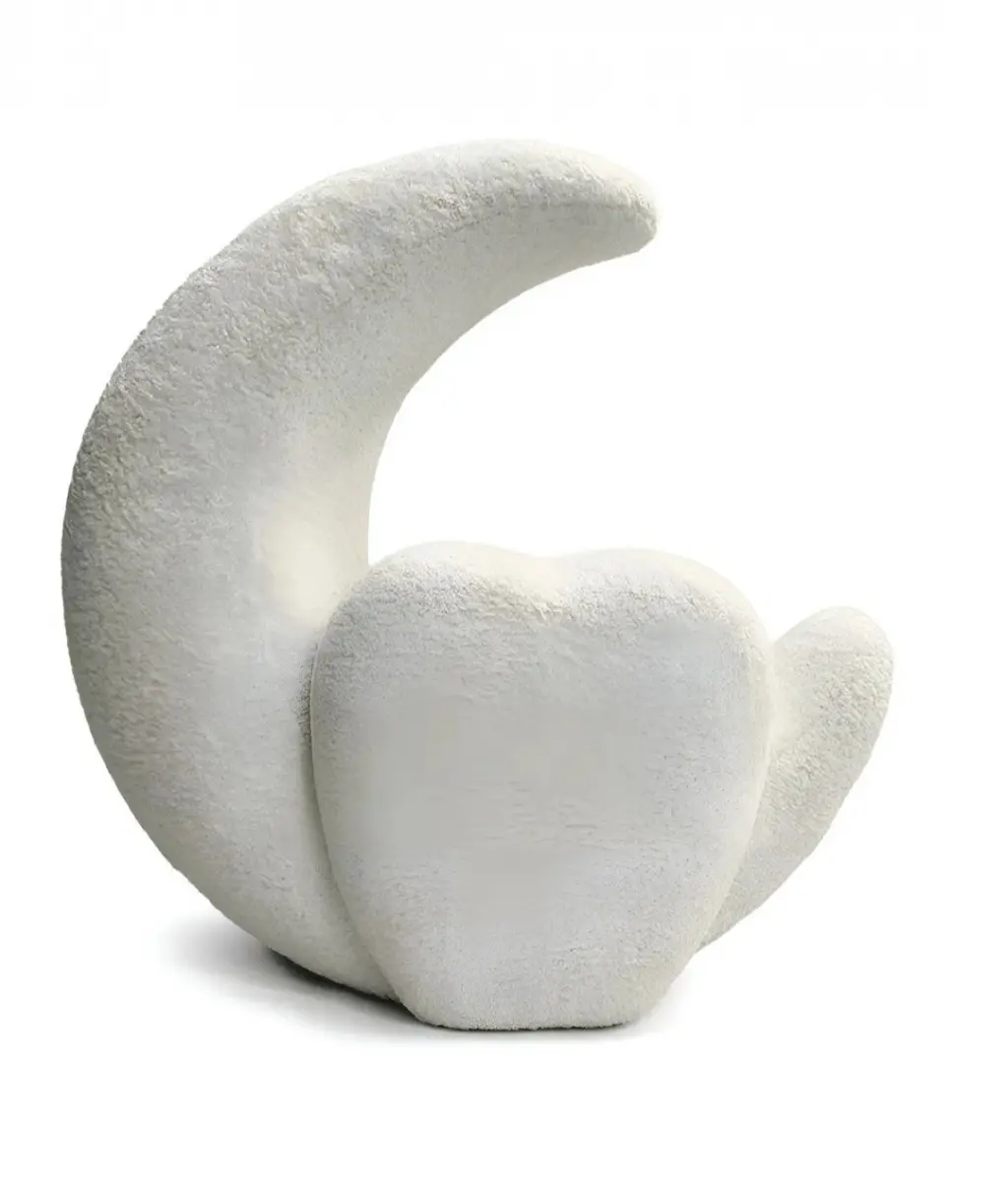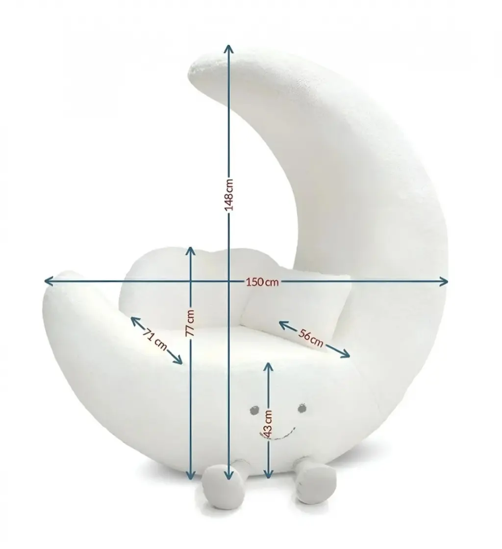Bu tasarım, "Celestial Playfulness" (Gökyüzü Oyunbazlığı) felsefesiyle, çocuksu bir neşe ve hayal gücünü modern yaşam alanlarına taşımak amacıyla kurgulanmıştır. Gövdenin tamamını sarmalayan beyaz buklet (bouclé) doku, tasarıma yumuşak bir bulut hissi verirken; ay formu (crescent moon),kullanıcıyı kucaklayan ergonomik bir sırt desteği sunar. Mobilyanın ön kısmındaki minimalist gülen yüz detayı ve küçük "el-ayak" eklentileri, nesneye bir karakter kazandırarak onu sadece bir oturma birimi olmaktan çıkarıp mekanın ruhuna eşlik eden bir "arkadaş" objeye dönüştürür.