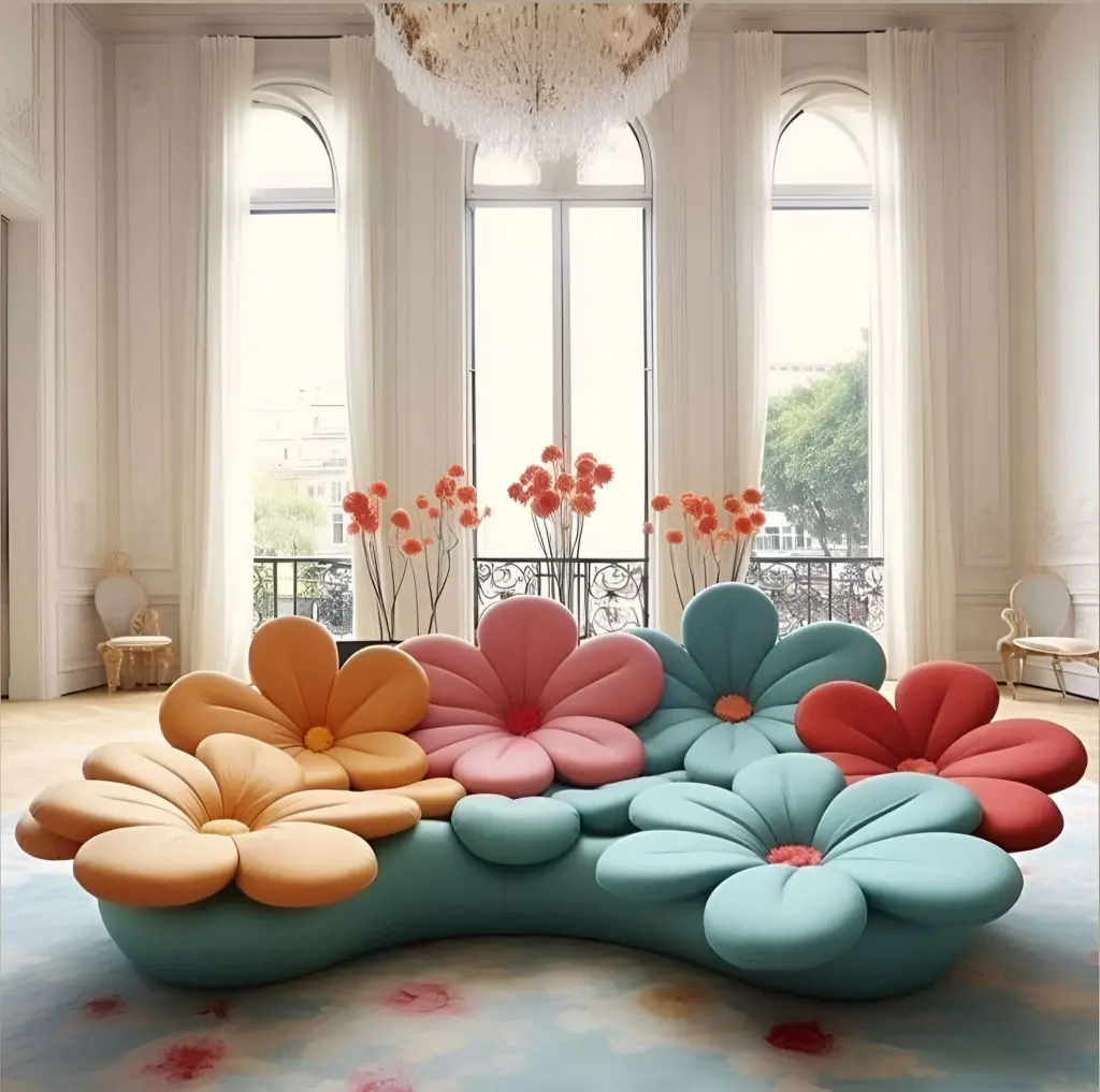 Sıradan mobilya anlayışını tamamen değiştiren bu tasarım harikası üçlü koltuk, yaşam alanlarınıza adeta sonsuz bir bahar getiriyor. Farklı renklerdeki dev çiçek formlarının bir araya gelmesiyle oluşan sırt ve oturum yapısı, hem görsel bir şölen sunar hem de sizi yumuşacık, puf puf bir konforla sarmalar. Turkuaz, pembe, turuncu ve kırmızının en tatlı tonlarını buluşturan bu parça, kavisli (organik) formuyla mekanın akışına uyum sağlar. Sadece bir oturma alanı değil, dekorasyonunuzun en çarpıcı sanat eseri olmaya adaydır.