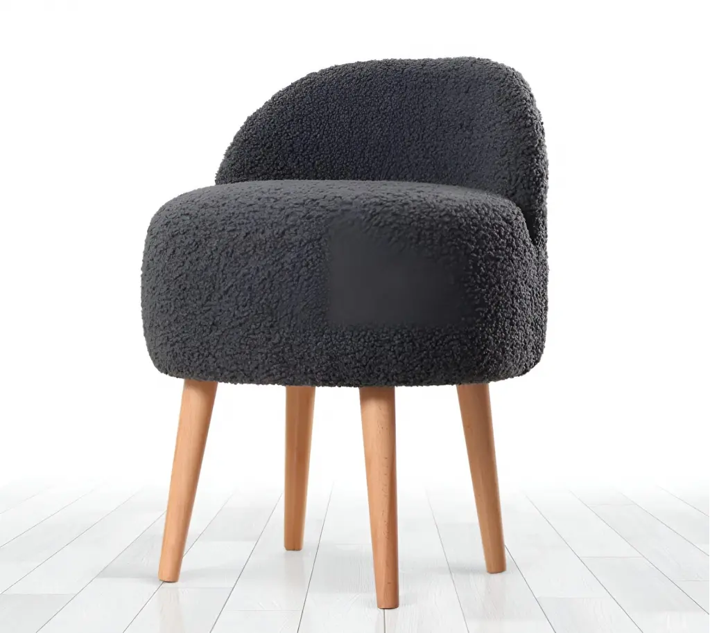 Bu sandalye, "Soft-Stone Aesthetics" (Yumuşak Taş Estetiği) anlayışıyla tasarlanmıştır. Yuvarlak hatları ve koyu rengiyle doğadaki pürüzsüz bir nehir taşını andırır. Tasarımın gücü, koyu antrasit/füme rengi ile yoğun dokulu bukle (bouclé) kumaşın birleşiminden gelir. Koyu renk, kumaşın kıvırcık dokusunu daha da belirginleştirerek mobilyaya görsel bir derinlik katar ve leke gizleme konusunda büyük avantaj sağlar. Alçak ve kavisli sırt yapısı (low-back),beli nazikçe desteklerken, açık renk konik ahşap ayaklar (tapered legs) koyu gövdeyi havaya kaldırarak tasarıma İskandinav bir ferahlık katar.