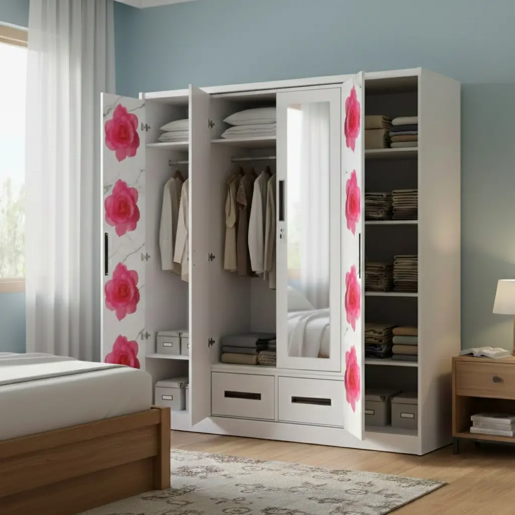 Bu ünite, "Biofilik Tasarım" (doğayı mekana taşıma) prensibini en çarpıcı haliyle uygular. Yan kapaklardaki dev ölçekli pembe gül illüstrasyonları, beyaz mermer görünümlü zemin üzerinde patlayarak odaya yüksek bir enerji ve romantik bir dram katar. Bu yoğun görsel şölen, merkezdeki düz ayna bloğu ile mimari bir dengeye oturtulmuştur; aynalar hem deseni kırar hem de mekana derinlik katarak "nefes alma payı" bırakır. Alt kısımdaki simetrik çekmeceler ve dikey krom kulplar, bu sanatsal kütleye endüstriyel bir disiplin ekler.
