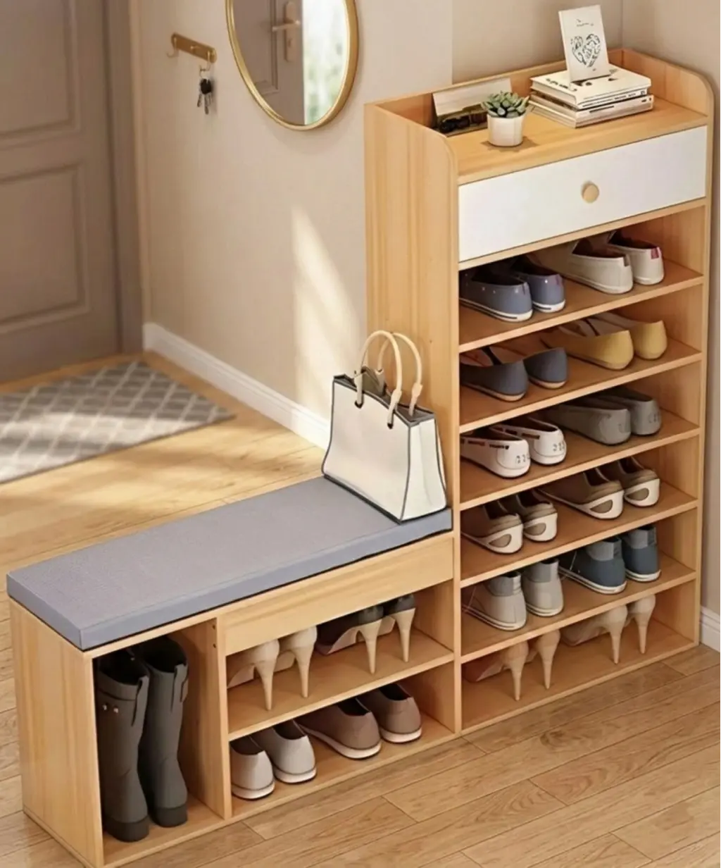 Antre ve giriş alanları için akıllıca tasarlanmış bu çok yönlü mobilya, konforu ve depolamayı tek bir ünitede birleştirir. Sol taraftaki yumuşak minderli oturma alanı (bench),ayakkabılarınızı giyip çıkarırken büyük kolaylık sağlar. Bench altındaki özel uzun bölme çizmeler için, raflar ise günlük ayakkabılar için ayrılmıştır. Sağdaki dikey kule bölümü, çok katlı yapısıyla maksimum ayakkabı depolama kapasitesi sunar. Üst kısımdaki şık beyaz çekmece; anahtar, cüzdan veya ayakkabı çekeceği gibi eşyalar için ideal bir saklama alanıdır. Doğal ahşap tonu ile girişinize ferah ve düzenli bir hava katar.