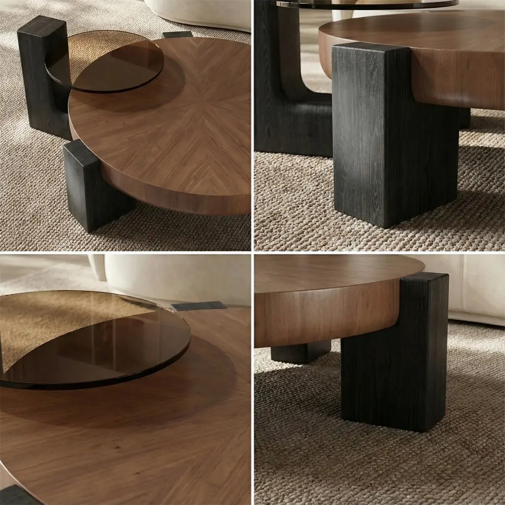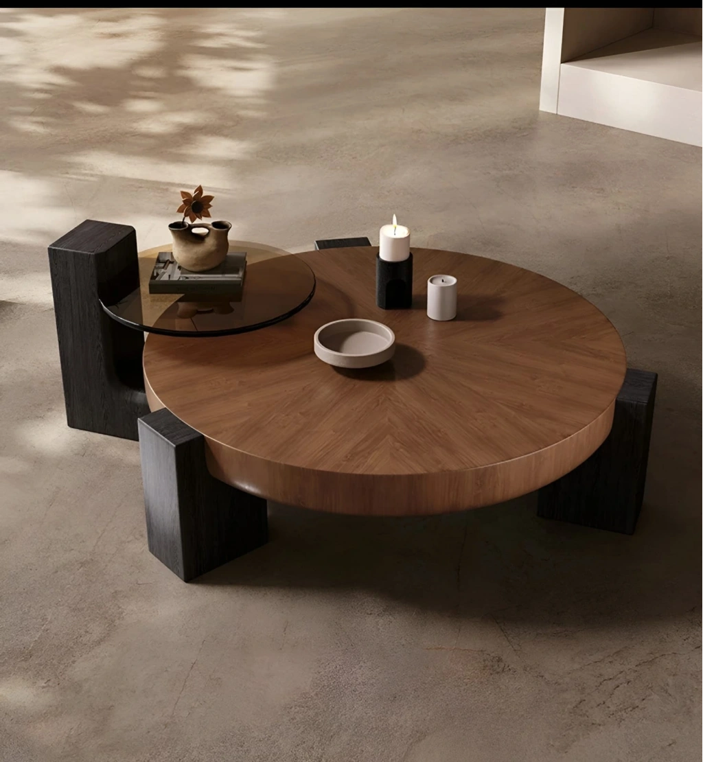Benzersiz formu ve dikkat çekici detaylarıyla fark yaratan bu yuvarlak sehpa, modern tasarım anlayışını sanatsal bir dille yorumlar. Üç ayağın oluşturduğu dengeli temel yapı, dördüncü ayağın masa yüzeyinin üzerinden yükselmesiyle sıra dışı bir form kazanır. Bu özel ayak, üst kısımda yer alan küçük cam yüzeyi taşıyarak sehpanın tasarımına hem derinlik hem de zarif bir dokunuş katar.