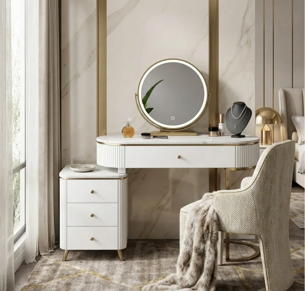 Şık ve fonksiyonel tasarımıyla öne çıkan bu makyaj masası takımı, günlük kullanım için pratik bir çözüm sunar. Geniş yuvarlak aynası sayesinde rahatça makyaj yapabilir, çekmeceli masasında ise tüm kozmetik ve aksesuarlarınızı düzenli şekilde saklayabilirsiniz.