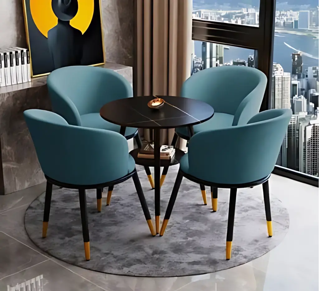 Modern ve şık tasarımıyla öne çıkan bu yuvarlak masa ve 4 sandalyelik takım, yemek alanlarınıza estetik ve fonksiyonel bir dokunuş katıyor. Sandalyelerin hafif yuvarlak hatları rahat oturum sağlarken, masanın yuvarlak formu mekâna ferahlık ve simetri kazandırır. Masanın sağlam ve estetik ayak yapısı, demir konstrüksiyon üstünde dengeli durarak uzun ömürlü kullanım sunar.
