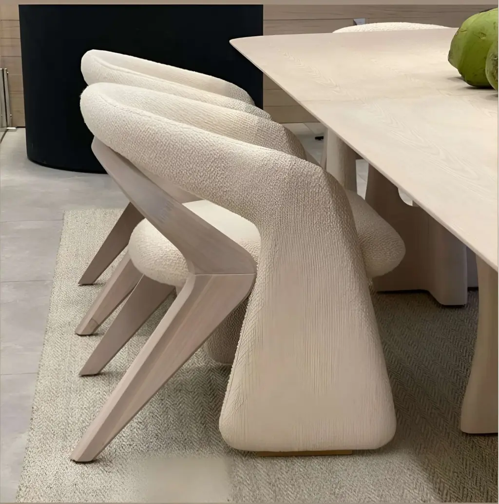 Sıradan sandalye formlarını yıkan bu tasarım, yemek odalarına bir sanat galerisi havası katar. Ön kısımdan kolçaklara kadar uzanan bütünleşik ve geniş gövde yapısı (monoblok görünüm), üzerindeki dikey çizgili dokusuyla dikkat çeker. Arka kısımdaki keskin açılı (V formlu) doğal ahşap ayaklar ise bu kütlesel duruşu hafifleterek tasarıma dinamik bir denge ve mimari bir derinlik kazandırır. Vücudu saran yarım ay şeklindeki sırt yapısı, hem konfor sunar hem de görsel bir şölen yaratır.