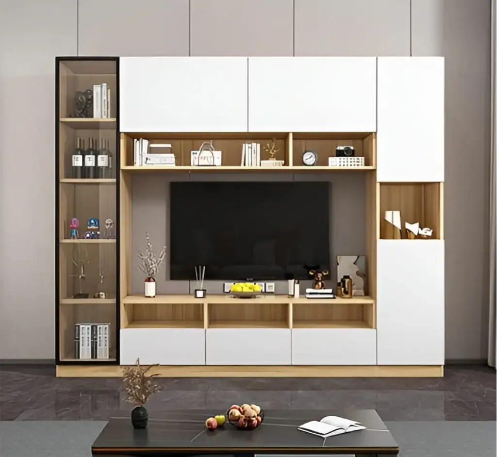 Fonksiyonelliği ve şıklığı bir arada sunan bu TV ünitesi, evinizin düzenini ve tarzını bir üst seviyeye taşıyor. Sol bölümde üst üste konumlandırılmış 5’li raf dekoratif objeler, kitaplar veya aksesuarlar için ideal bir sergileme alanı oluşturuyor. Ortada televizyon bölümü yer alırken, alt kısımda eşyalarınızı toparlamanıza yardımcı olacak raflı alan mevcut. Üst kısımda ve sağ tarafta yer alan raflar ise ek depolama ve sergileme imkânı sağlıyor.