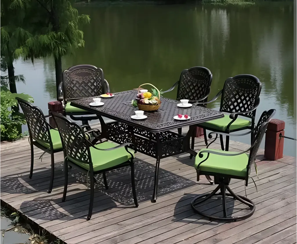 Ailenizle veya misafirlerinizle keyifli yemekler için ideal olan bu masa takımı, dayanıklı dış mekân malzemeleriyle uzun ömürlü kullanım sunar. 1 adet geniş dikdörtgen masa ve 6 konforlu sandalyeden oluşan set, modern çizgileriyle balkon, teras ve bahçelerde estetik bir görünüm oluşturur.
