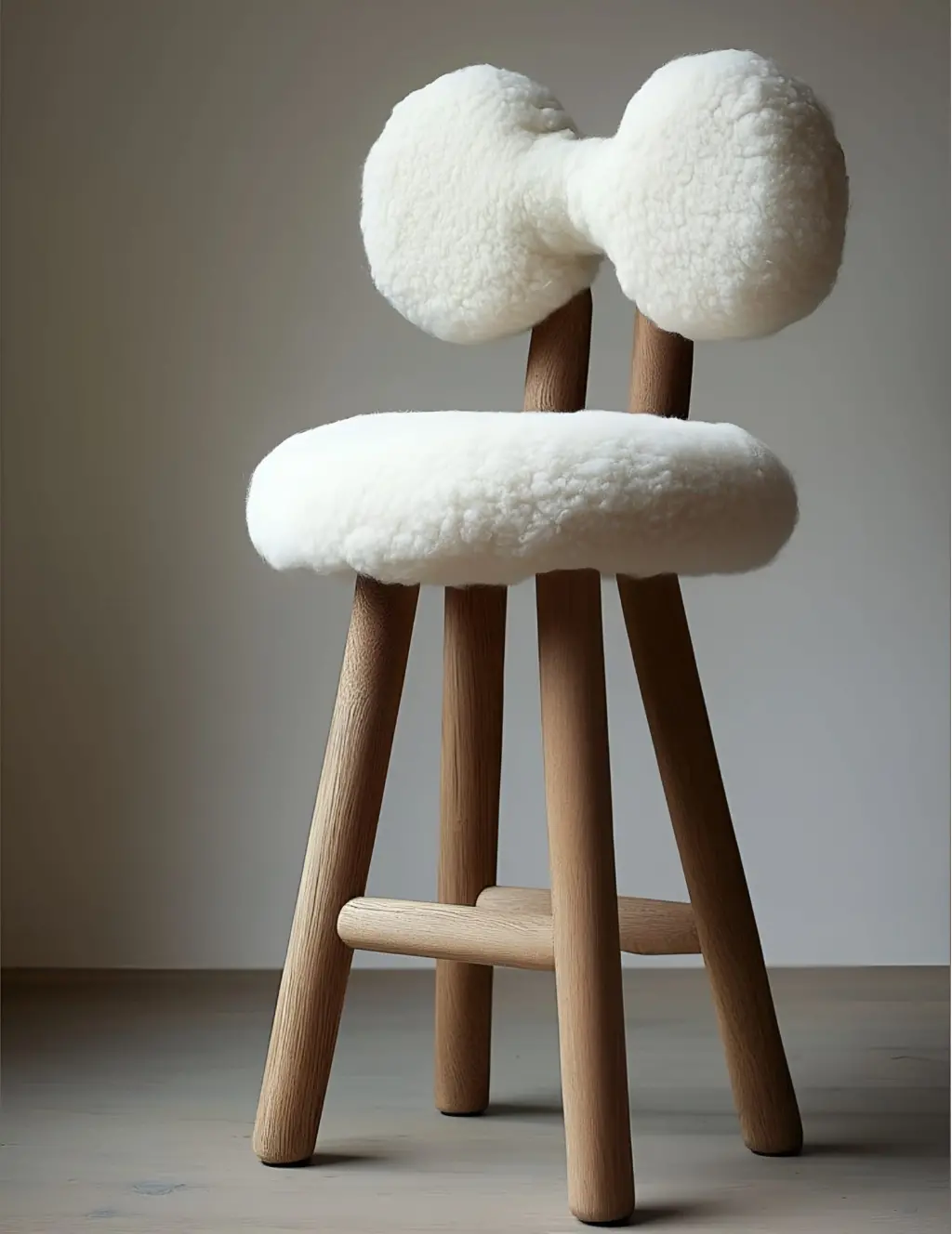 Bu yüksek tabure, "Whimsical Elegance" (Düşsel Zarafet) anlayışıyla tasarlanmıştır. Tasarımın en vurucu imzası, sırt kısmında yer alan ve pofuduk bir fiyonk (bow) veya kelebek formundaki desteğidir. Bu detay, mobilyaya hem sevimli hem de şık bir kimlik kazandırır. Oturma yüzeyi ve sırtlık, yoğun dokulu beyaz koyun yünü (shearling/bouclé) kumaşla kaplanmıştır; bu da sert bir taburede oturma deneyimini yumuşacık bir bulutun üzerine tünemeye dönüştürür. Gövdeyi taşıyan yüksek ve konik masif ahşap ayaklar, alt kısımdaki çapraz bağlantı (footrest) ile desteklenerek hem sağlamlık hem de ayaklar için konfor sağlar.