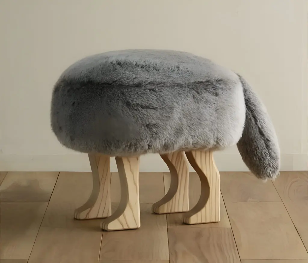 Bu puf, "Abstract Zoomorphism" (Soyut Hayvan Biçimciliği) sanatının harika bir örneğidir. Tasarımı diğerlerinden ayıran en belirgin özellik, arkasından sarkan yumuşacık gri kuyruğudur. Gövdeyi saran yoğun gri peluş (faux fur), gerçekçi bir kürk hissi vererek dokunma isteği uyandırır. Ancak tasarımın ustalığı detaylarda gizlidir; masif ahşap ayaklar düz birer sopa gibi değil, hayvan patisi ve bacağı (paw-shaped legs) formunda yontulmuştur. Bu detay, pufa sanki her an yürüyecekmiş gibi canlı ve dinamik bir ifade kazandırır.