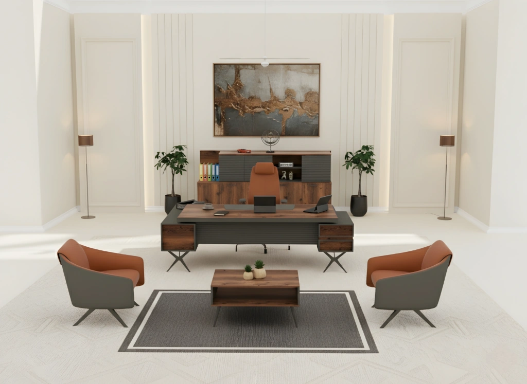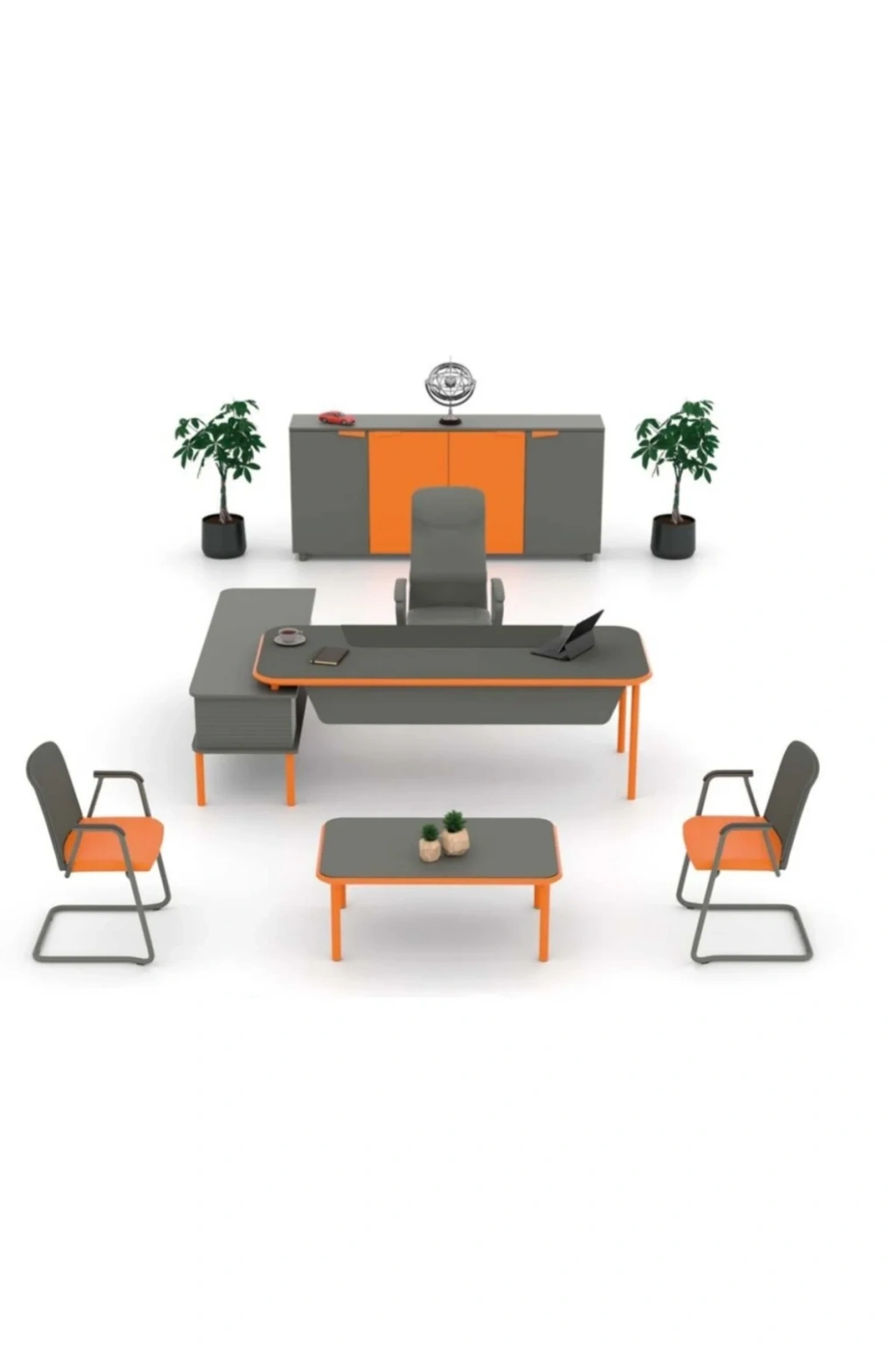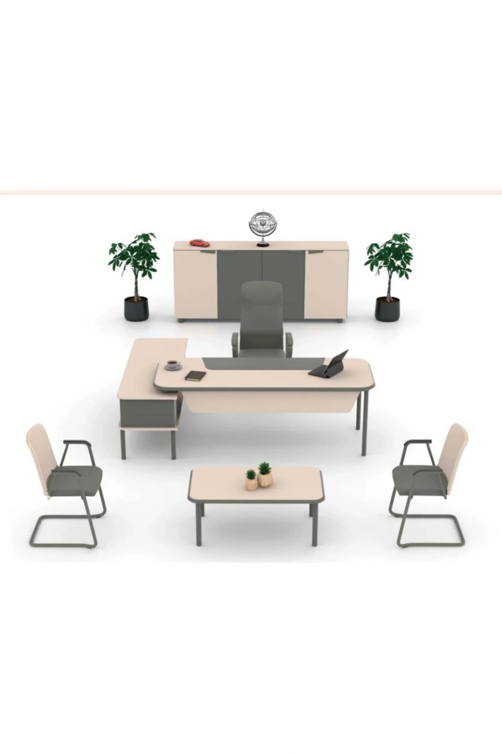 Modern tasarımı ve işlevsel yapısıyla öne çıkan bu yönetici ofis takımı, ofisinize hem şıklık hem de prestij kazandırır. Ana masa yüksek ve geniş yüzeyiyle konforlu bir çalışma alanı sunarken, yan tarafa entegre edilen daha alçak L masa ek alan ve pratik kullanım sağlar. Bu özel tasarım sayesinde evrak, bilgisayar ve günlük işleriniz için düzenli bir çalışma ortamı elde edersiniz. Ergonomik müdür koltuğu uzun süreli oturumlarda konfor sağlarken, ön bölümde yer alan misafir sandalyeleri ve sehpa ziyaretçilerinizi şık bir şekilde ağırlamanıza imkân verir.