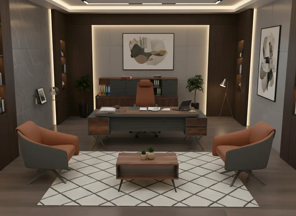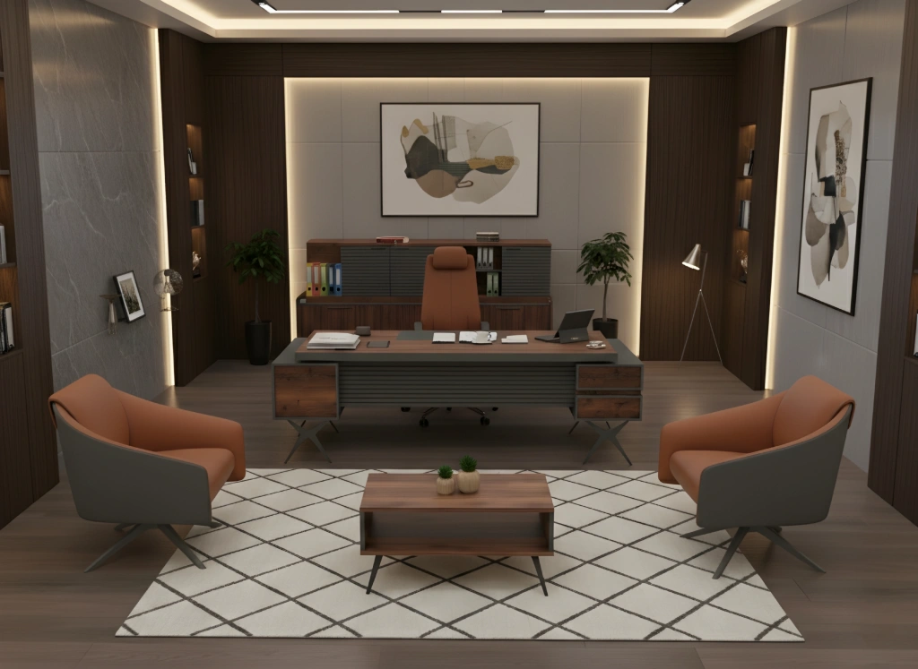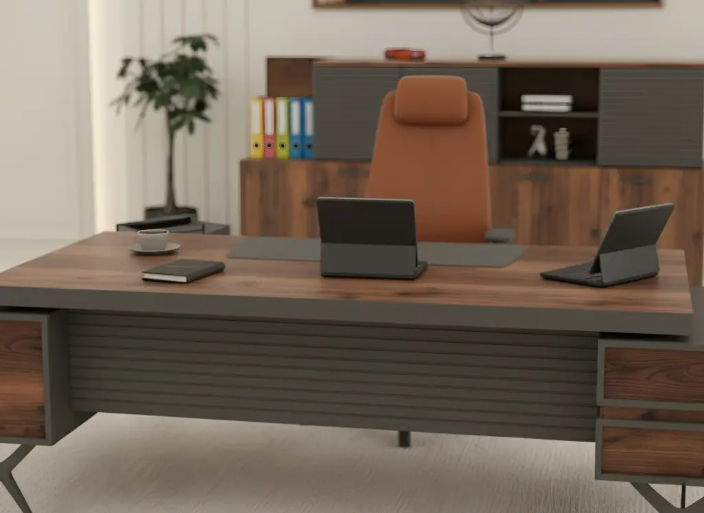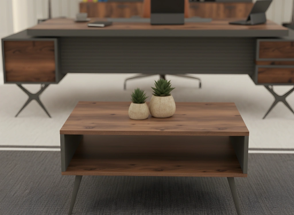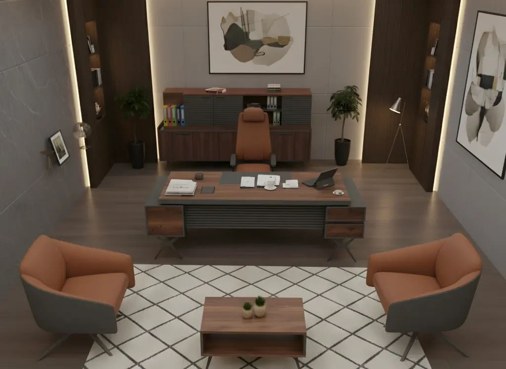 Modern tasarımı ve işlevsel yapısıyla öne çıkan bu yönetici ofis takımı, ofisinize hem şıklık hem de prestij kazandırır. Ana masa yüksek ve geniş yüzeyiyle konforlu bir çalışma alanı sunarken, yan tarafa entegre edilen daha alçak L masa ek alan ve pratik kullanım sağlar. Bu özel tasarım sayesinde evrak, bilgisayar ve günlük işleriniz için düzenli bir çalışma ortamı elde edersiniz. Ergonomik müdür koltuğu uzun süreli oturumlarda konfor sağlarken, ön bölümde yer alan misafir sandalyeleri ve sehpa ziyaretçilerinizi şık bir şekilde ağırlamanıza imkân verir.