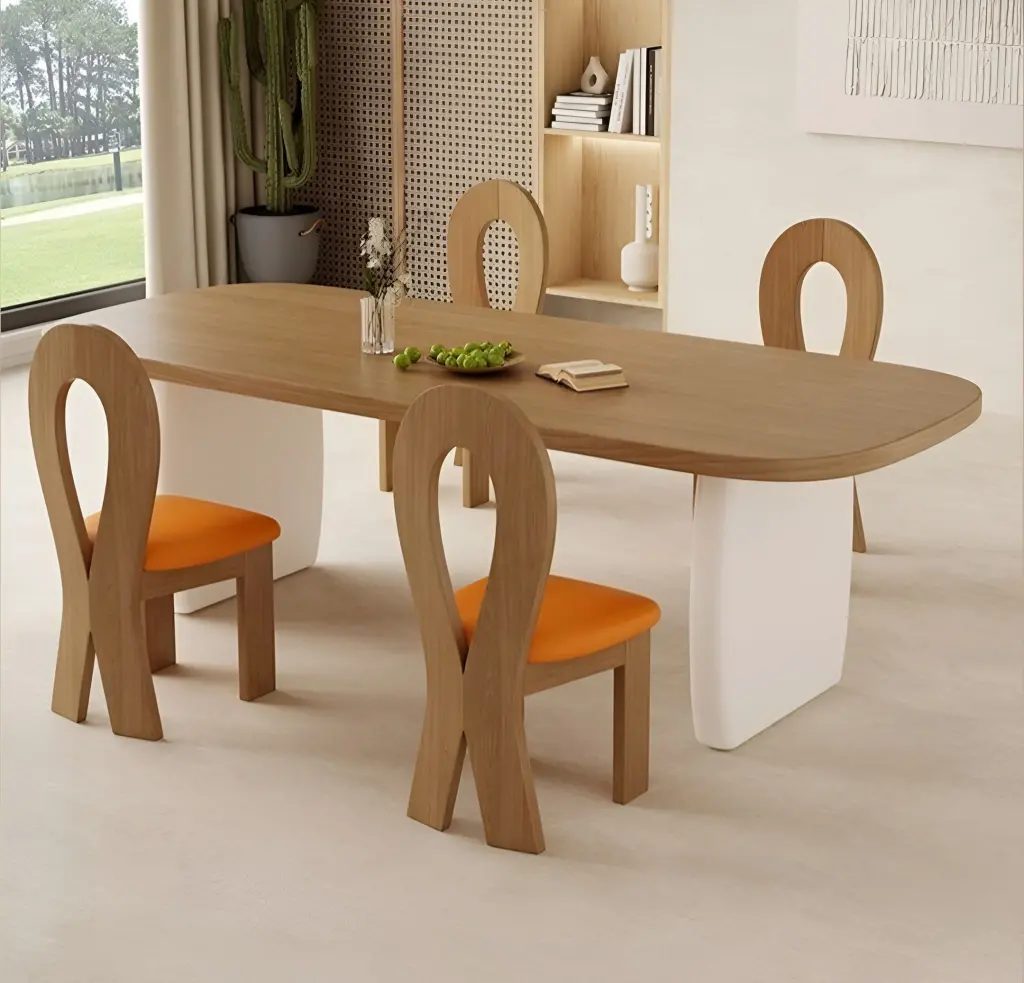 Bu yemek grubu, "Negative Space Architecture" (Negatif Alan Mimarisi) prensibiyle tasarlanmıştır. Sandalyelerin sırt kısmındaki "Anahtar Deliği" (Keyhole/Loop) formu, ahşabın kütlesel ağırlığını kırarak ışığın ve havanın sandalyenin içinden geçmesine izin verir. Bu, mekanı daha ferah gösterir. Masanın kendisi, beyaz mat sütun ayaklar (pillar legs) üzerinde duran devasa bir ahşap tabladan oluşur; bu "beyaz ve ahşap" kombinasyonu (Japandi stili), dingin ve temiz bir zemin yaratır. Tasarımın sürpriz elementi ise, bu sakin tonların ortasında patlayan canlı turuncu (vitamin orange) oturum minderleridir. Bu renk tercihi, tasarıma genç, dinamik ve iştah açıcı bir enerji katar.