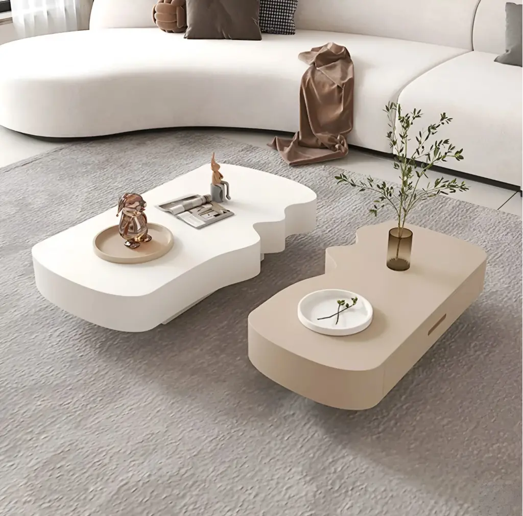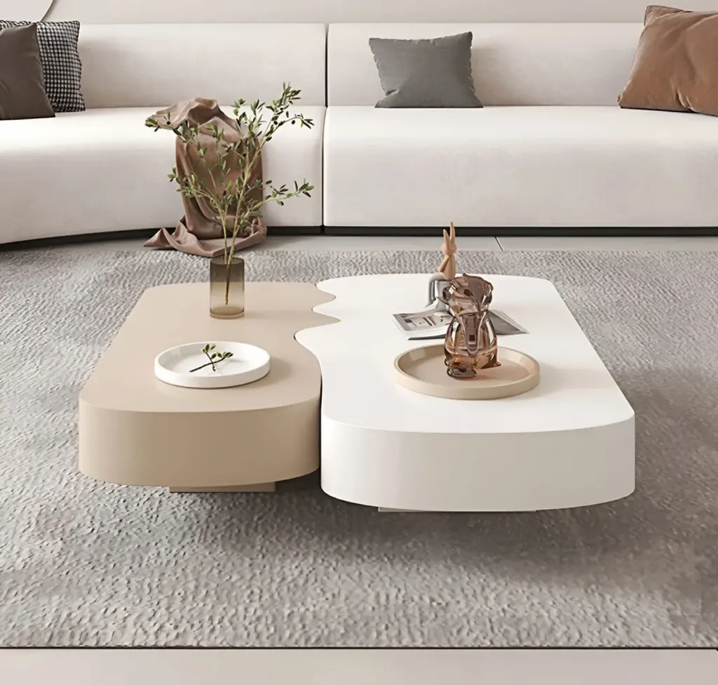 Uzun parça geniş yüzeyiyle ana sehpa işlevi görürken, kısa parça tamamlayıcı olarak hem dekoratif hem de pratik kullanım sağlar. Birbirine geçmeli formu sayesinde modern dekorasyonlara özgün bir karakter katar.