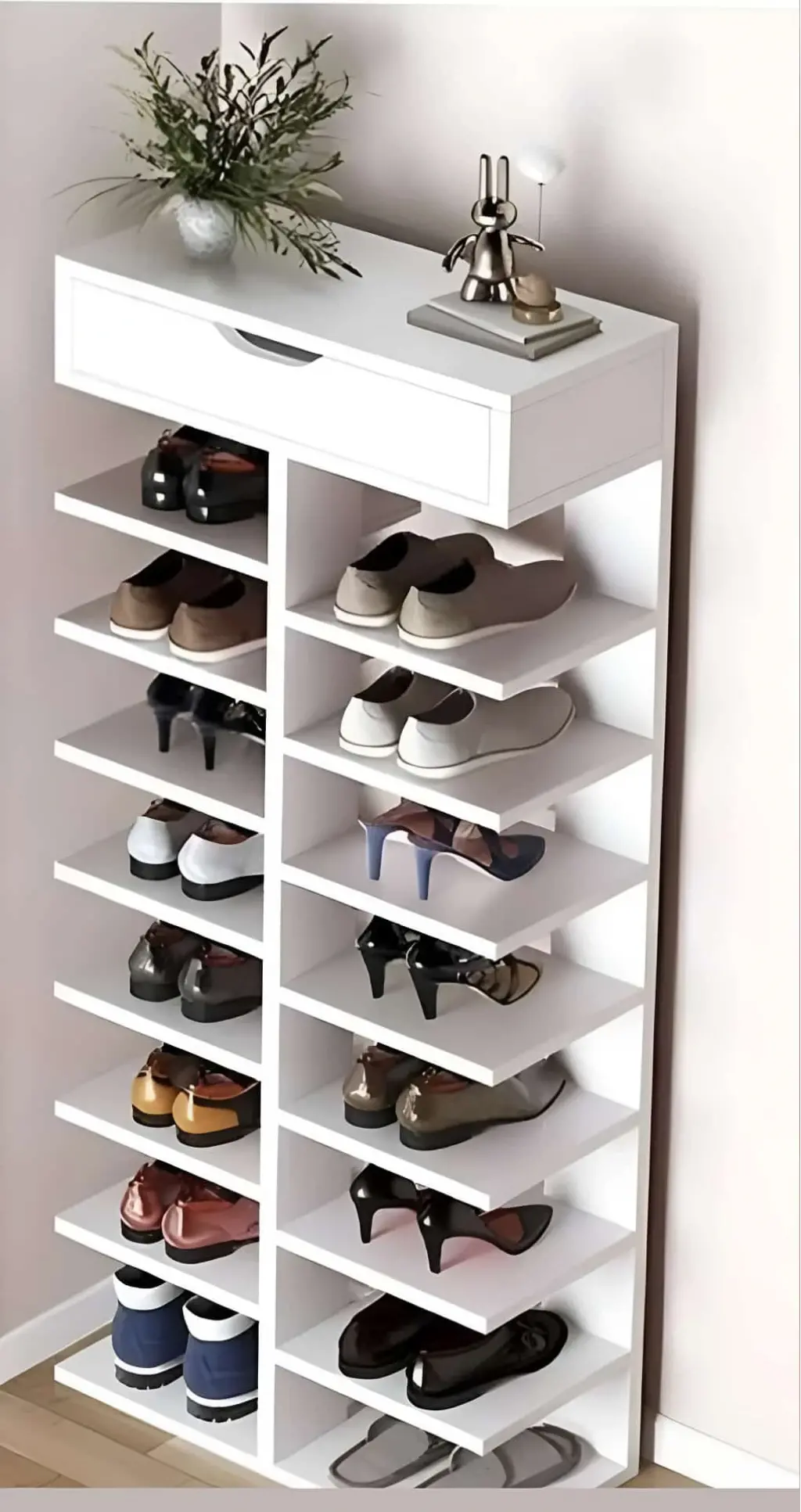 Antrelerdeki dağınıklığı şık bir şekilde toparlayan bu dikey ayakkabılık, az yer kaplayan kompakt tasarımıyla öne çıkar. En üstte bulunan geniş çekmece; anahtar, fatura, cüzdan veya ayakkabı bakım ürünleri gibi küçük eşyalar için pratik bir saklama alanı sunar. Alt kısımdaki çift sütunlu açık raf sistemi, ayakkabılarınıza hızlı erişim sağlarken aynı zamanda sürekli hava almalarına imkan tanıyarak koku oluşumunu engeller. Sade beyaz rengi ve minimalist duruşuyla her türlü dekorasyon tarzına uyum sağlar.