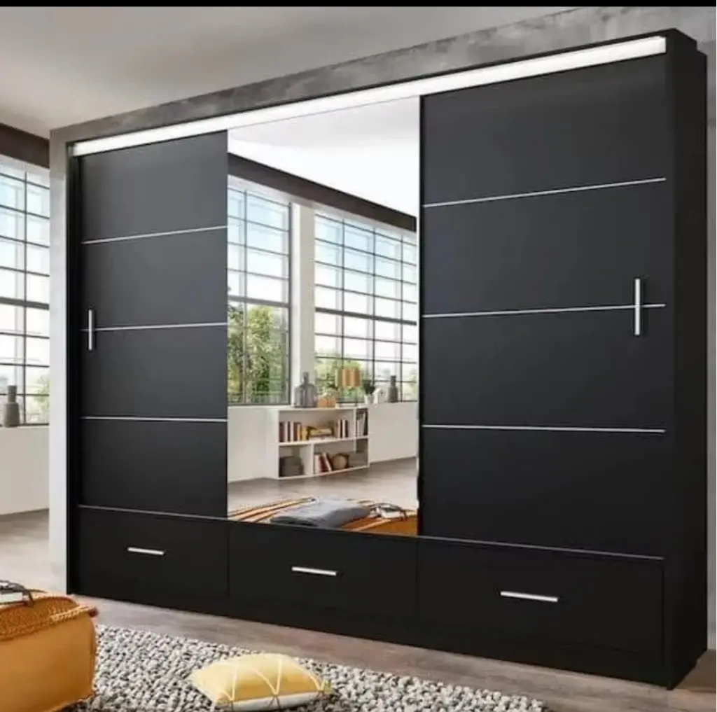 Bu ünite, mat siyahın (matte black) ışığı yutan asil dokusunu, metalik yatay çizgilerle keserek disipline eder. Kapaklar üzerindeki bu gümüş şeritler, dolaba endüstriyel bir ritim katarken, gözü yanlara doğru yönlendirerek odayı daha geniş algılatır. Tasarımın en çarpıcı mimari hamlesi ise "Podyum Baza" yapısıdır; dolap gövdesi zemine oturmak yerine, üçlü geniş çekmece bloğu üzerine yükselerek güçlü bir kaide üzerinde durur. Merkezdeki tam boy ayna, bu siyah kütleyi "yarıp geçerek" ışığı içeri alır ve karanlık yüzeylerin odada boğucu bir etki yaratmasını engeller.