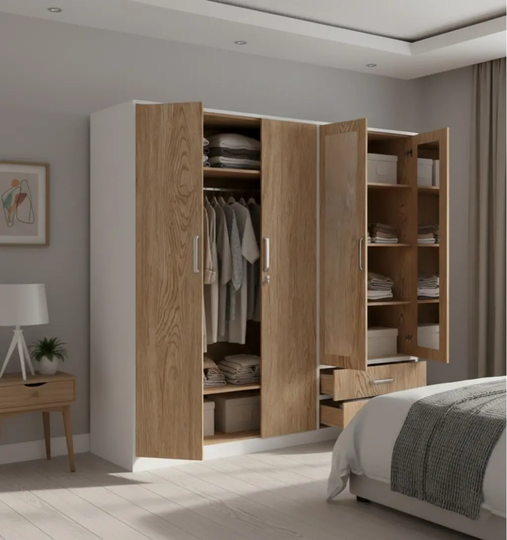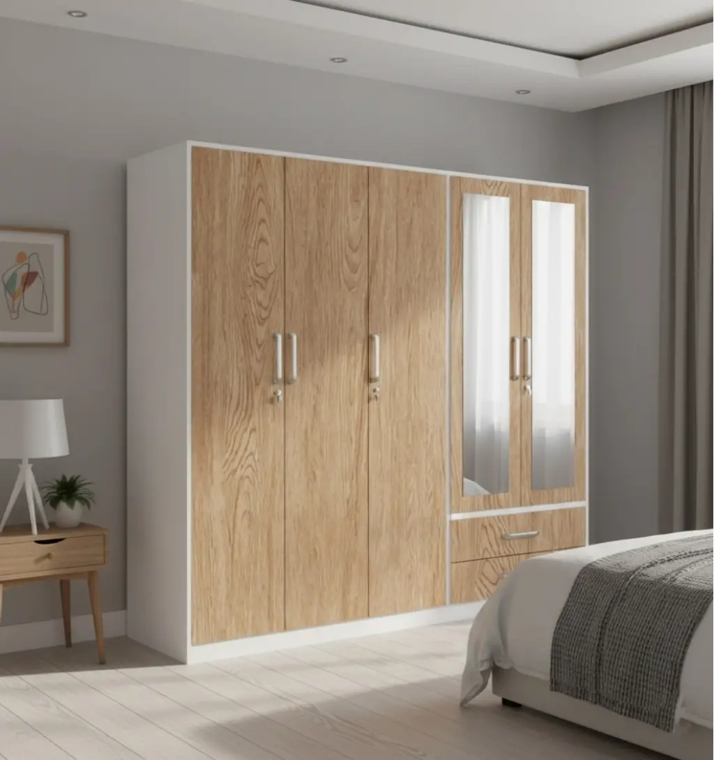 Bu tasarım, "Parçalı Fonksiyon" mimarisini benimser. Sol bloktaki üçlü ahşap kapak, kesintisiz devam eden doğal meşe hareleriyle (wood grain) odaya sıcak ve rustik bir doku katarken, geniş askı alanlarını gizler. Sağ blok ise tamamen "Güne Hazırlık" için özelleştirilmiştir; üstteki çiftli ayna kapaklar giyinme sürecini hızlandırırken, alttaki geniş çekmece ikilisi çorap/iç çamaşırı gibi küçük parçalar için pratik bir erişim sunar. Dolabı çevreleyen ince beyaz çerçeve (kasa),yoğun ahşap dokusunu modern bir çizgiyle sınırlar ve tasarıma taze bir nefes aldırır.