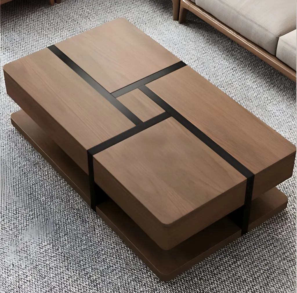 Bu sehpa, "Geometric Segmentation" (Geometrik Bölümleme) estetiğini yansıtır. Doğal ceviz kaplamanın sıcak yüzeyi, mat siyah şeritlerle (inlay/kakma) kesilerek, Piet Mondrian tablolarını andıran modern bir ızgara sistemine dönüştürülmüştür. Bu siyah hatlar, sadece bir desen değil, ahşap blokları bir arada tutan bir "iskelet" hissi yaratır. Sehpanın iki katmanlı yapısı (double-deck), üst bloğun alt taban üzerinde "yüzüyormuş" (floating) gibi durmasını sağlar. Keskin geometrik desenlerine rağmen, köşelerin yumuşatılmış olması (rounded edges), ürünü çocuklu evler için güvenli ve görsel olarak "akışkan" hale getirir.