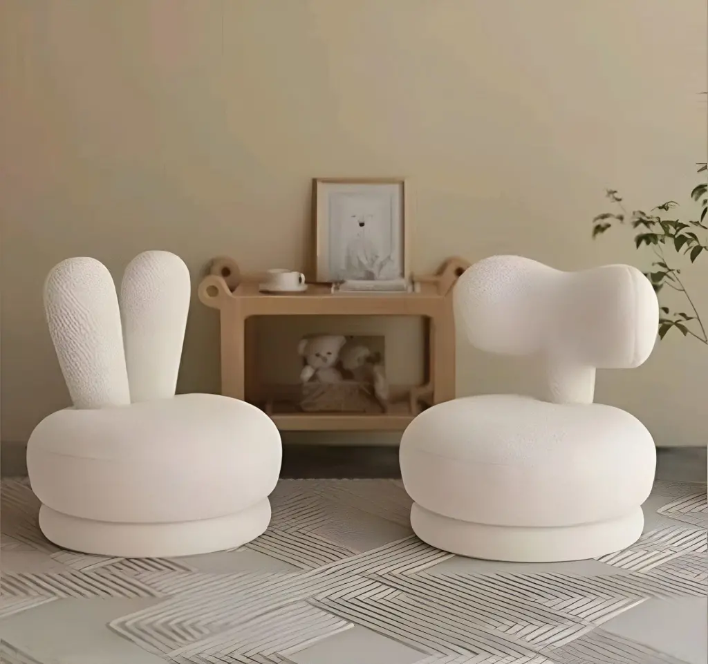 Bu set, "Abstract Neoteny" (Soyut Çocuksu Tasarım) anlayışıyla kurgulanmıştır. Her iki puf da zeminde "Macaron" benzeri boğumlu ve dolgun bir taban üzerinde yükselir. Soldaki model, dik kulaklı soyut bir tavşanı (veya barış işaretini) andırırken; sağdaki model yatay yerleşimiyle bir bulutu, kemiği veya fıstığı çağrıştırır. Yüz detaylarının (göz, ağız) bilerek kullanılmaması, çocuğun bu objelere o anki ruh haline göre dilediği karakteri yüklemesine olanak tanır. Kaplamada kullanılan kar beyazı dokulu kumaş (mikro bukle), tasarıma pürüzsüz ve saf bir dokunuş katar.