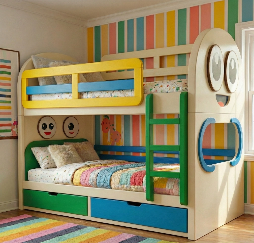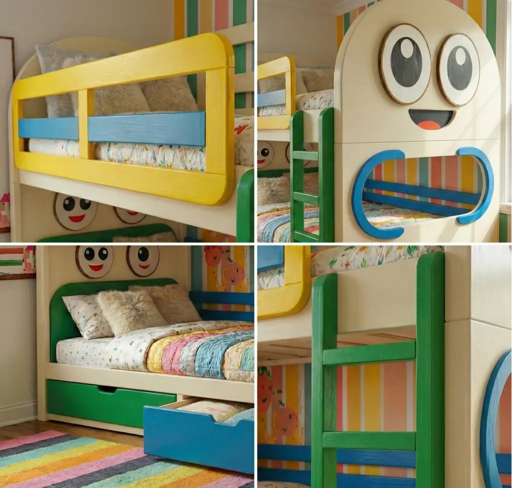 Sıradan ve sıkıcı ranzaların aksine bu ürün, odaya sadece bir uyku alanı değil, başlı başına bir karakter ve oyun arkadaşı kazandırır. Yan paneli süsleyen büyük gözler ve gülümseyen formlar; tasarıma sadece görsel bir neşe değil, aynı zamanda hikaye dolu bir kimlik yükler. Canlı sarı, yeşil ve mavi blok renklerin enerjisi, krem gövdenin sakinliğiyle dengelenerek odaya dinamizm katar. Alt kısımdaki geniş depolama çekmeceleri ile fonksiyonelliği sanatla birleştiren bu parça, çocukların yaratıcı dünyasının vazgeçilmezi olacak.