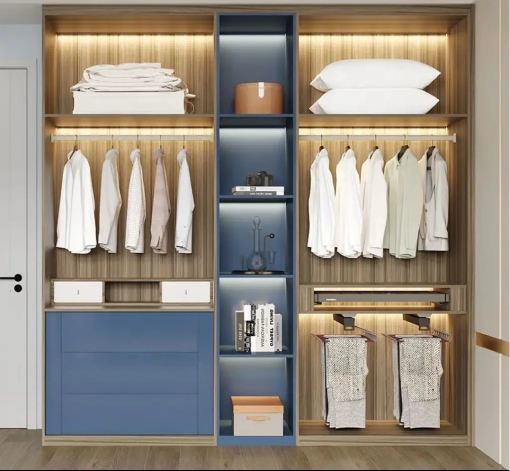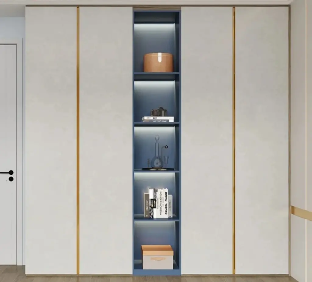 Bu ünite, "Linear Continuity" (Çizgisel Süreklilik) prensibiyle tasarlanmıştır. Zeminden tavana kesintisiz uzanan gold (altın) profil kulplar, geniş krem/beyaz panelleri dikey olarak böler ve tavanı görsel olarak yükseltir. Bu "duvar etkisi" yaratan sakin cephe, merkezdeki sürpriz "Mavi/Gri Galeri Boşluğu" ile kırılır. Koyu mavi tonlarındaki bu açık raf sistemi, entegre LED aydınlatmalarıyla dolabın içine derinlik katarak, monotonluğu bozan sofistike bir "nefes alma noktası" oluşturur.