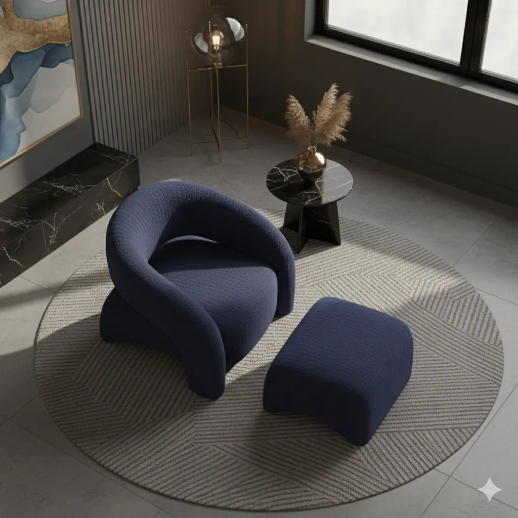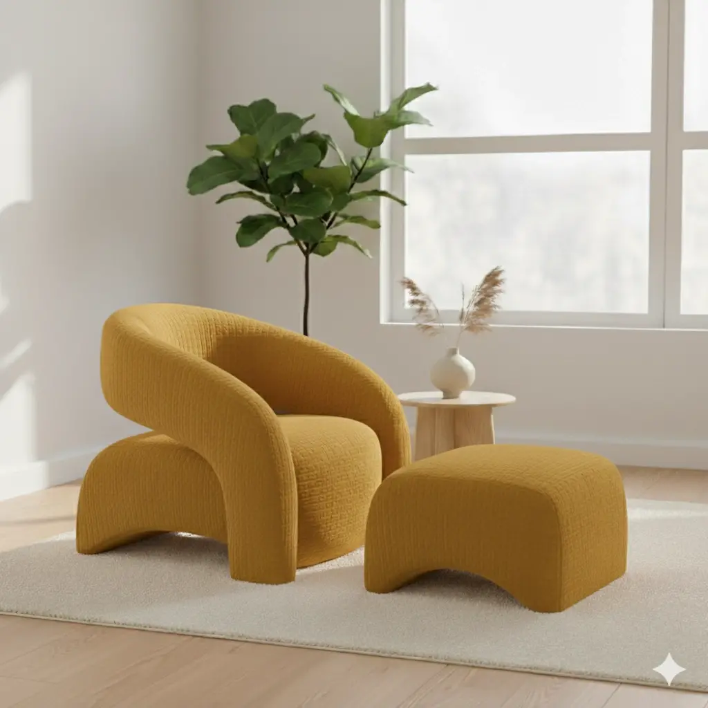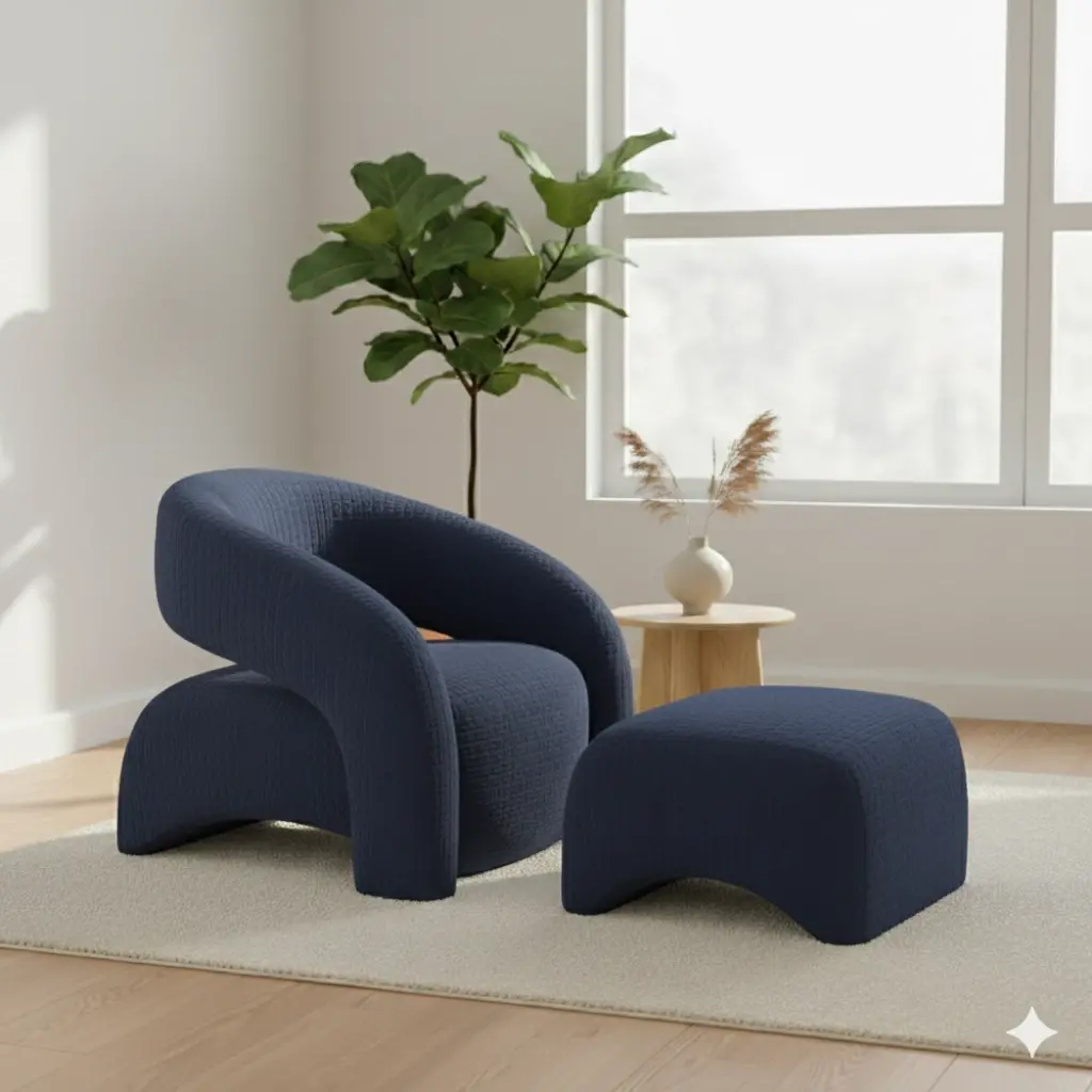 Sculptural Form: Bir mobilyadan çok, salonun ortasına bırakılmış modern bir sanat eseri gibi duran kıvrımlı silüet.